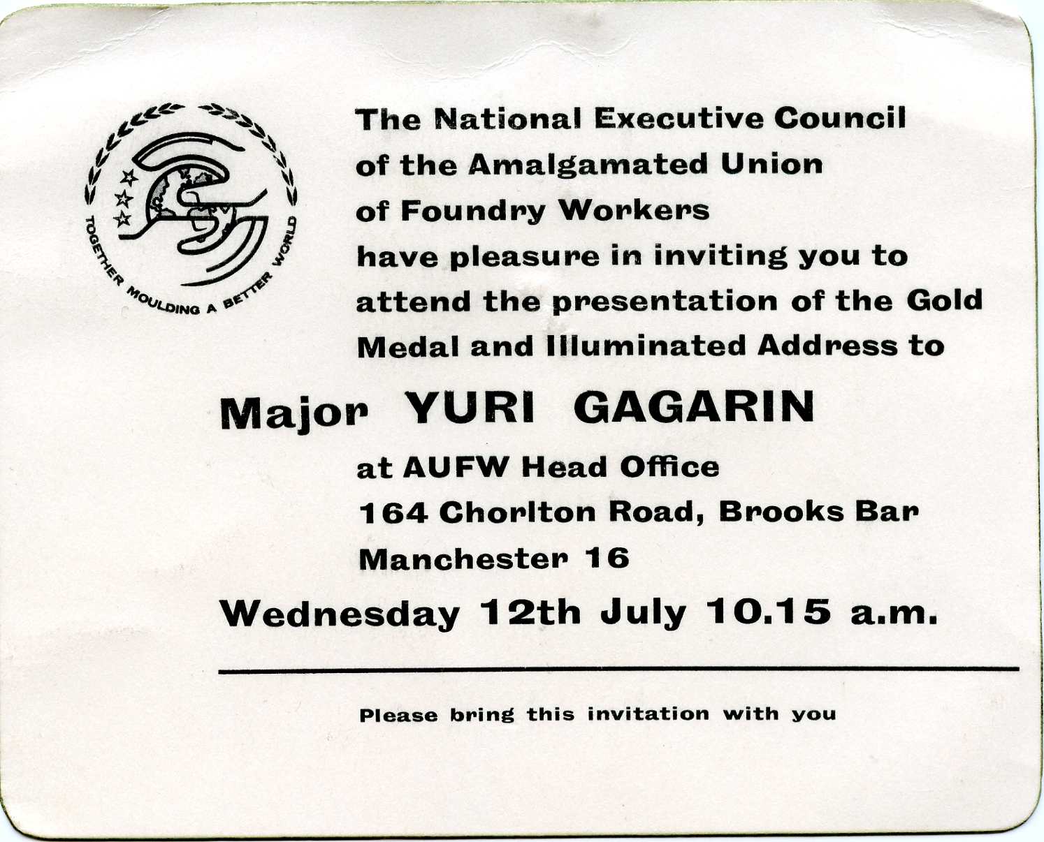 When Yuri Gagarin visited Manchester. CGN regular, Joyce Baines revealed that she worked in the Trade Union offices which Gagarin visited where she shook hands with him. She kept her entry ticket for the day which is reproduced above. See: Gagarin video