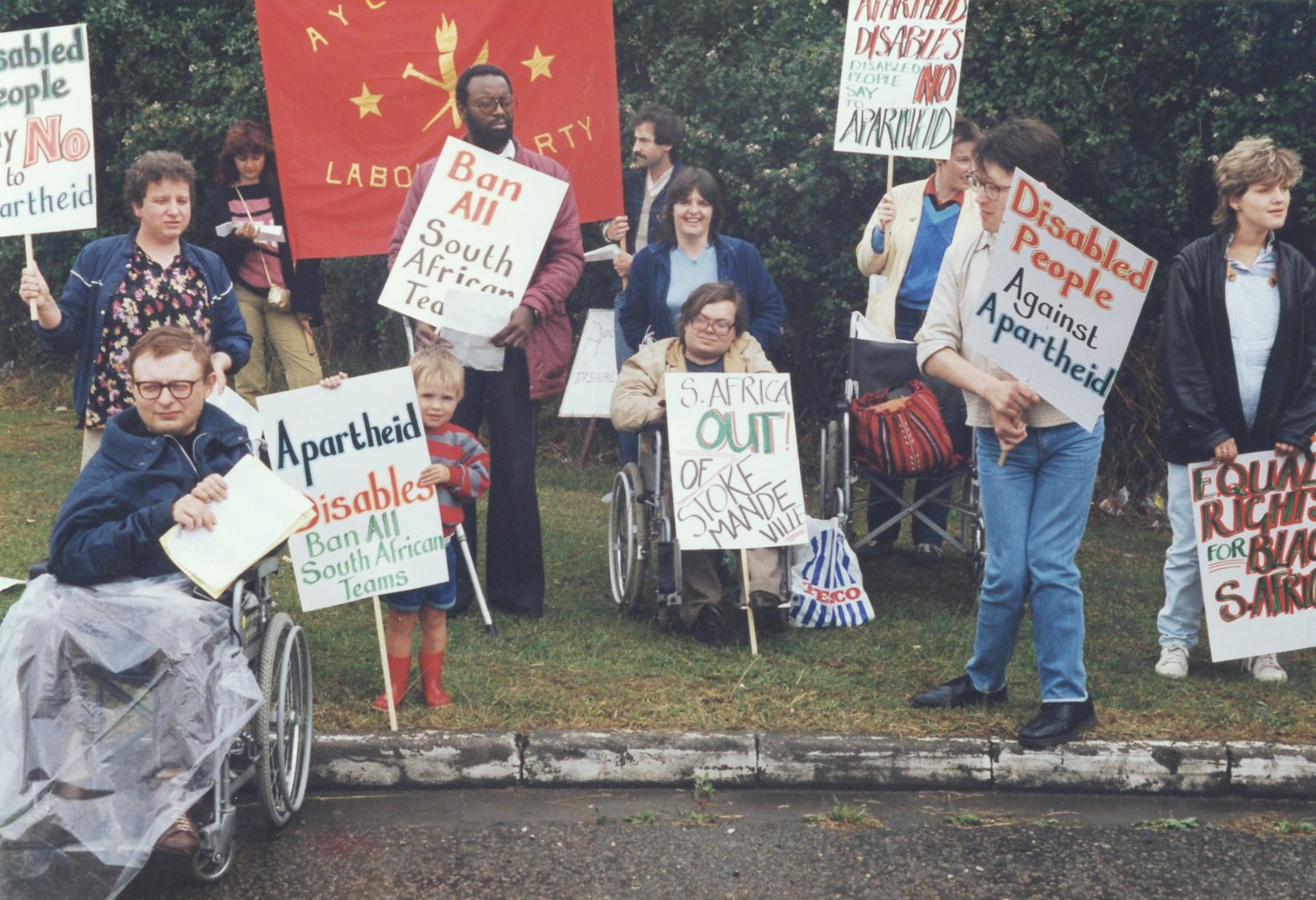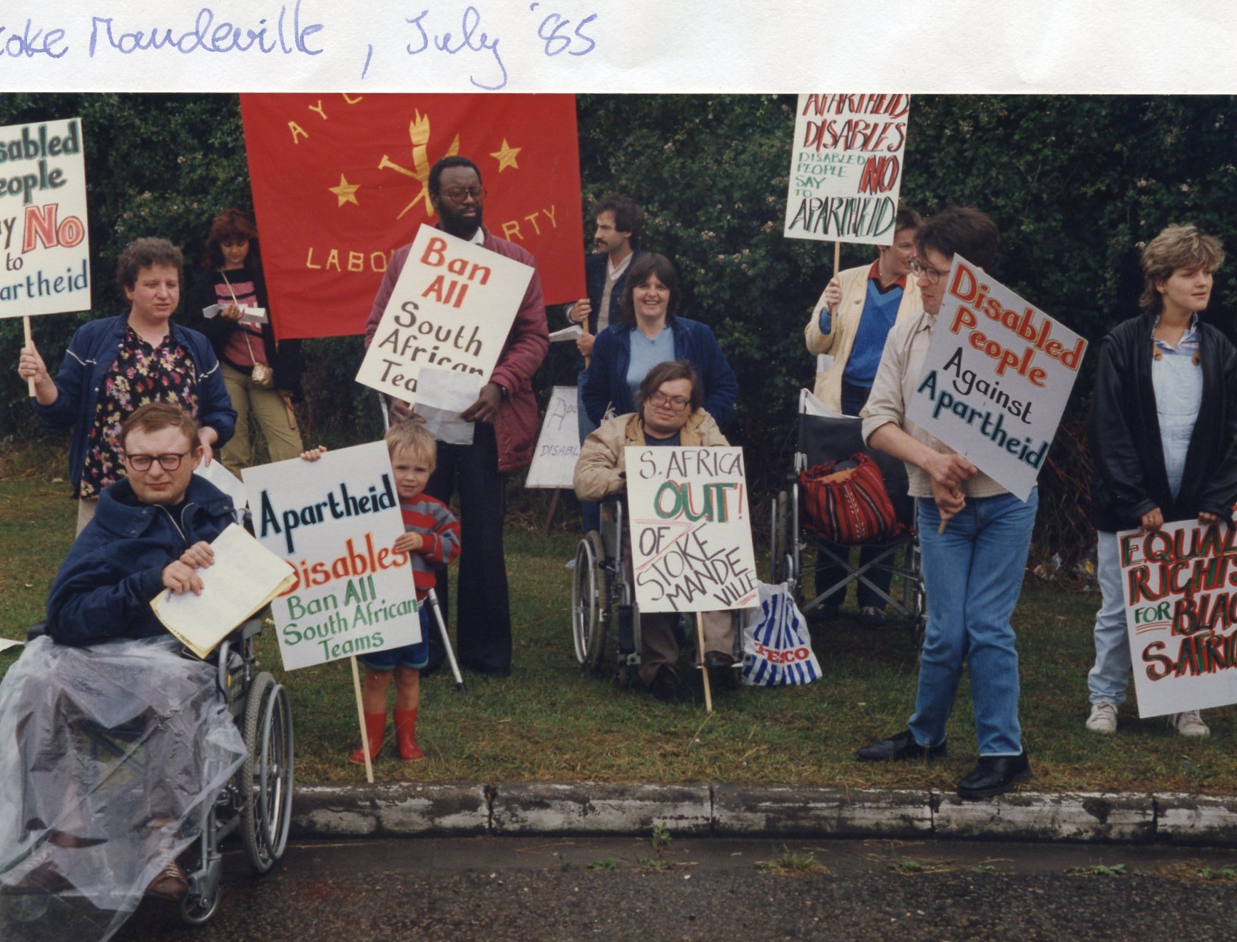photo of the disabled people (many from Manchester) protesting about the participation of a South African team outside Stoke Mandeville hospital in1985.