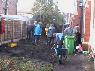 On a lovely, sunny but very cold January morning, we got the Chorlton Good Neighbours gardening project under way. The idea is to reclaim a piece of land next to our offices and make it into a garden, sitting place and vegetable growing area. It will be great for all our users and volunteers, but it is especially targeted at getting more older men involved in the project.