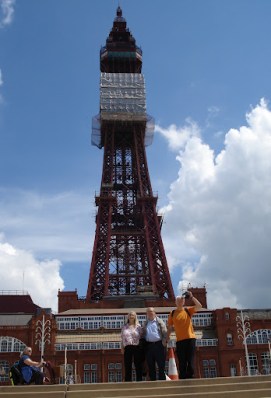 Joyce, Arthur & Bernard from Good Neighbours in front of Blackpool Tower