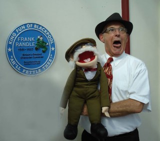 Chris Lee and his dummy Cuthbert in front of the Frank Randle plaque