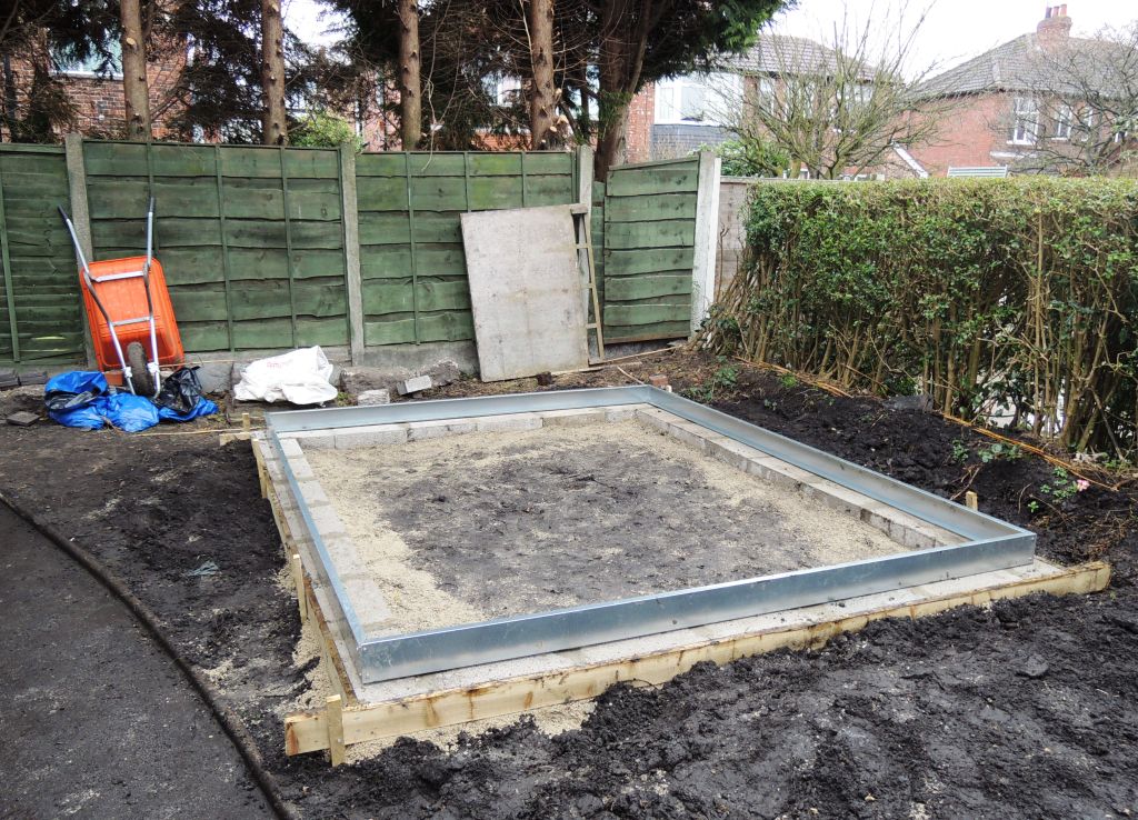 The next day, Saturday 9th March 2013, saw us start on the next stage of assembling the greenhouse . It was another cold and damp day. The base had been constructed the day before. The ground had been levelled and a trench had been dug out for the breeze block base. We had pummeled the earth solid and flat using a rammer, then we laid a load of sandy gravel. John then put the breeze blocks in position and mortared in between the joints. Meanwhile the aluminium base had been assembled and we put in place on top of the breeze blocks and left it overnight to set.