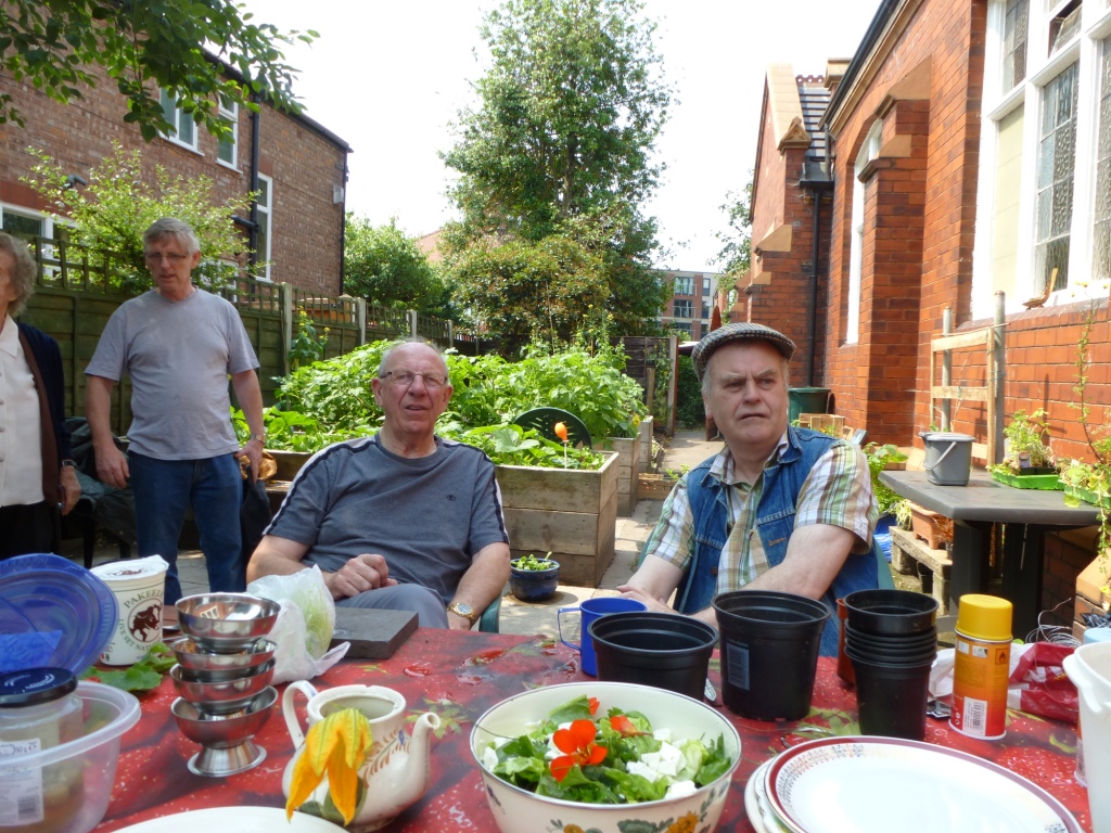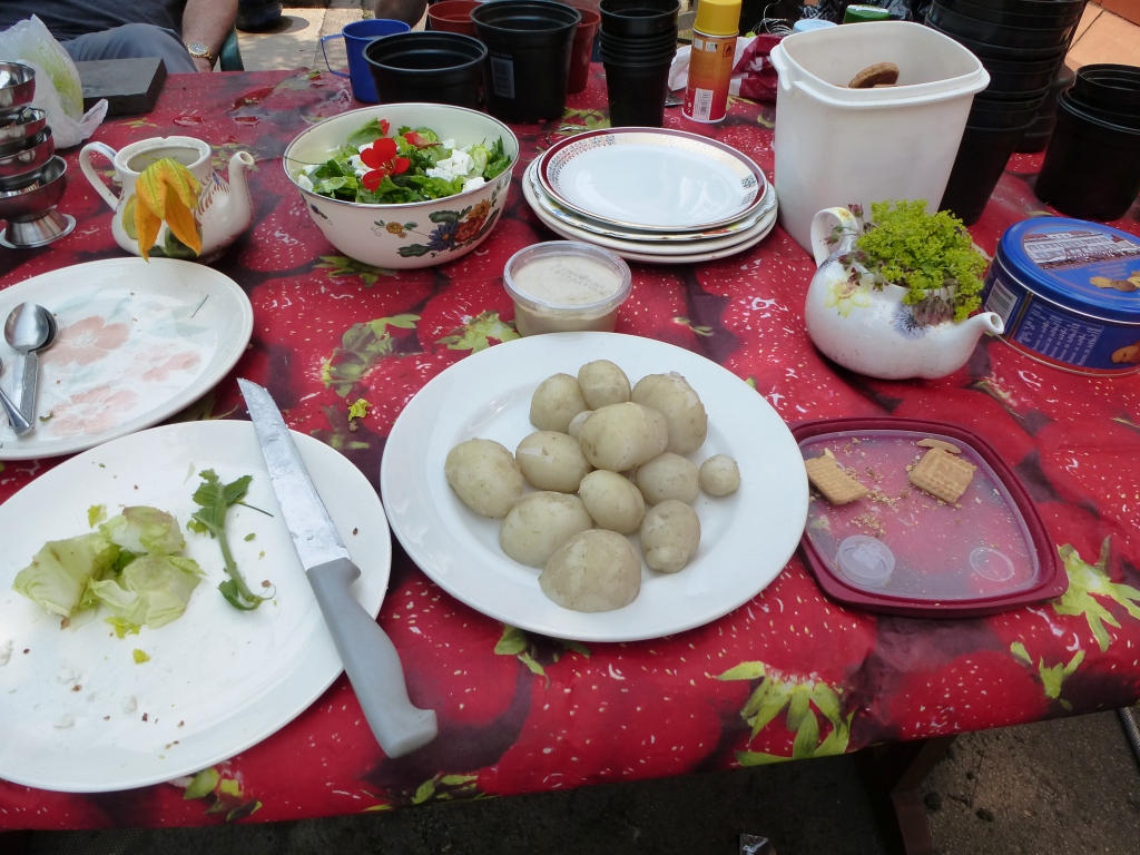 After all the hard work in cold weather earlier in the year, the good neighbours garden is coming in to its own. On the first day of a predicted heat wave, Fri 5th July 2013, we had a great outdoor meal with many of the ingredients coming from our garden