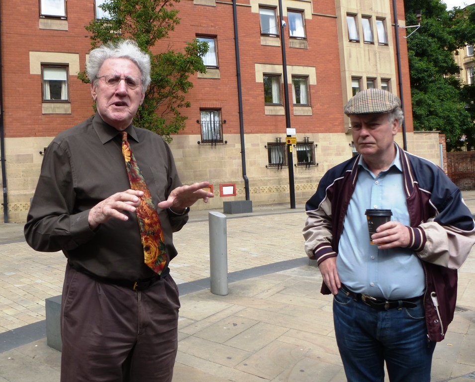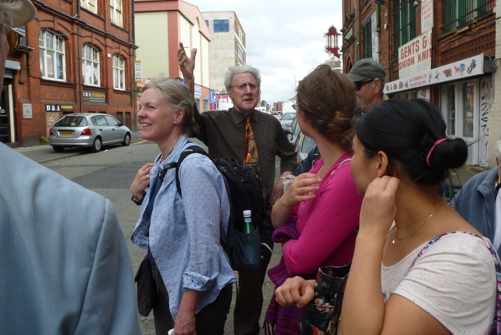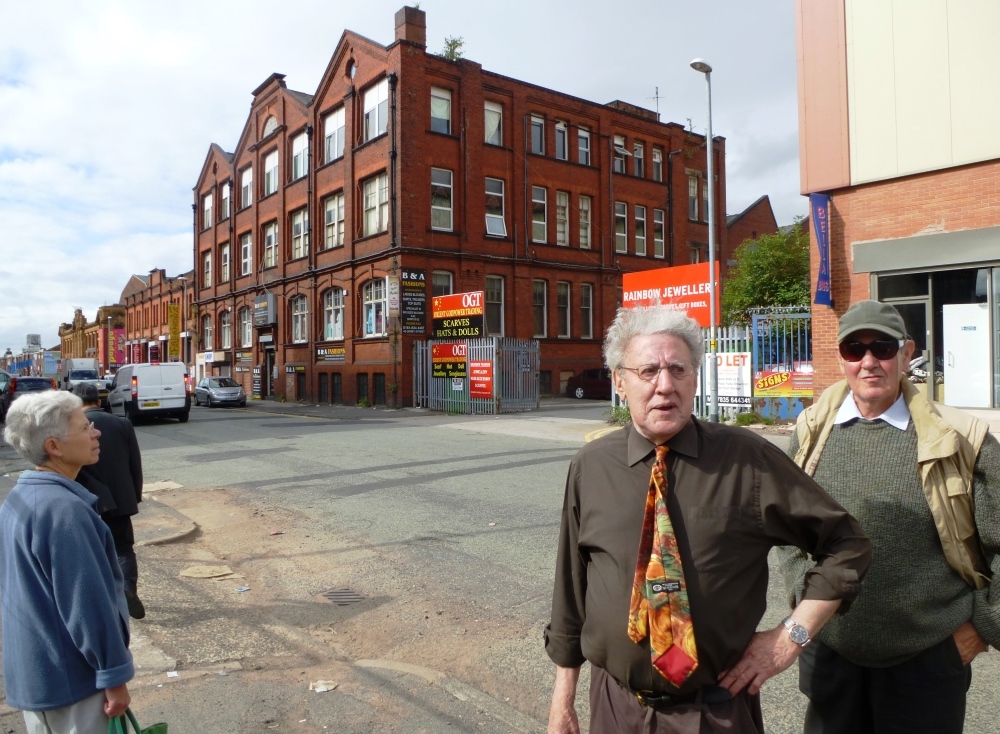 Bill talks to the group at the bottom of Cheetham Hill Road, opposite what was was the Red Bank district whose poverty was described by Engels in “The Condition of the Working Class in England”.and in which many of the first Jewish immigrants to Manchester from Eastern Europe settled. Bill is sur[rised that no recognition is given to this historically important community and the district has now been renamed the “Green Quarter” to help sell the new blocks of flats
