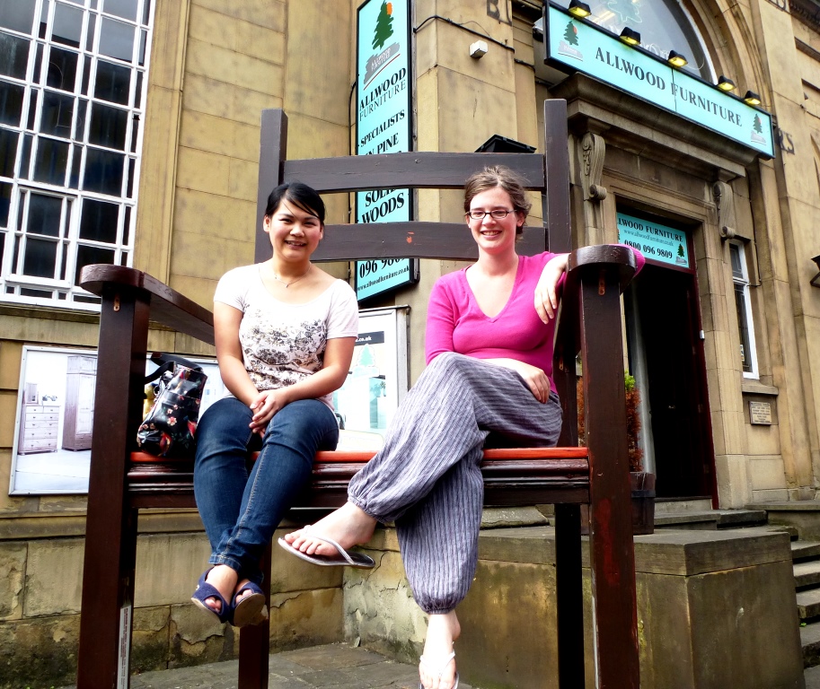 Oy Chee and Carolyn sit on a big chair outside what is now a furniture store at the beginning of Cheetham Hill Road, near Victoria and which had been one of the first synagogues to be opened. It had been previously a Christian chapel, but was surplus to their needs and so was converted to a synagogue