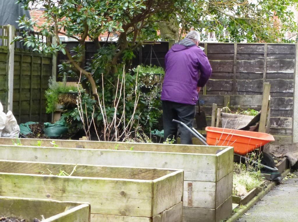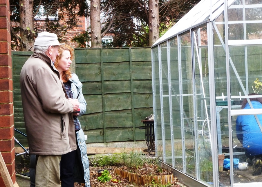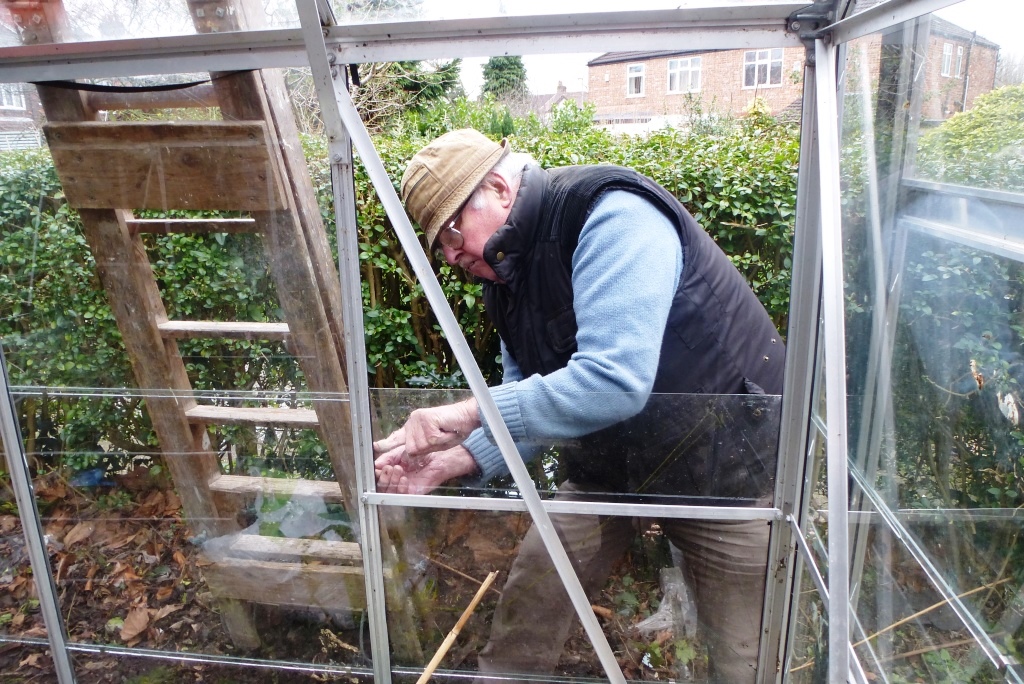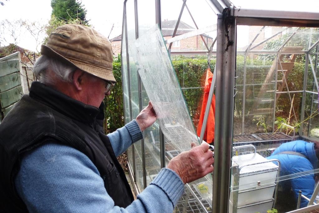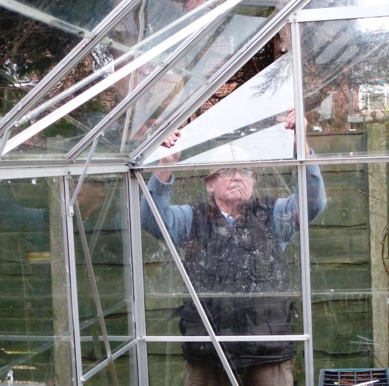 This Friday (19-02-14) we had John’s assistance in beginning to repair the greenhouse after the damage caused by the recent gale. Altogether 9 windows were blown out and 3 of them smashed. So the reinforced glass stood up pretty well and the pieces of glass weren’t dangerous shards but like the starred bits from a shattered windscreen