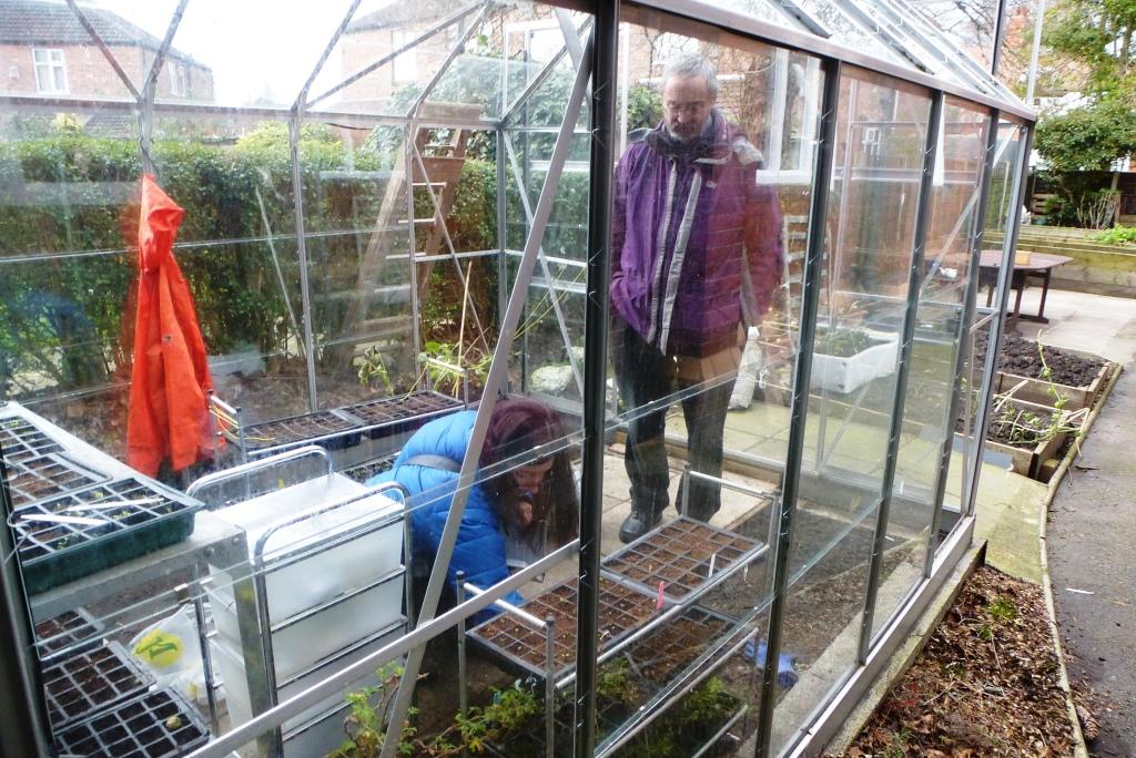 Newcomer Tom and CGN worker Diane inspecting the greenhouse