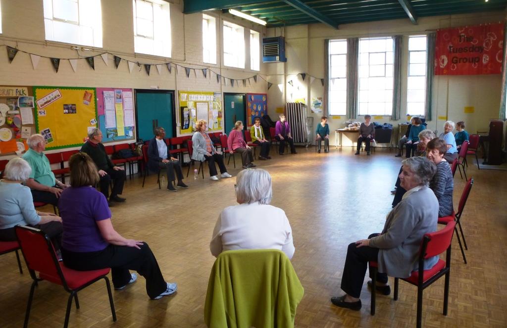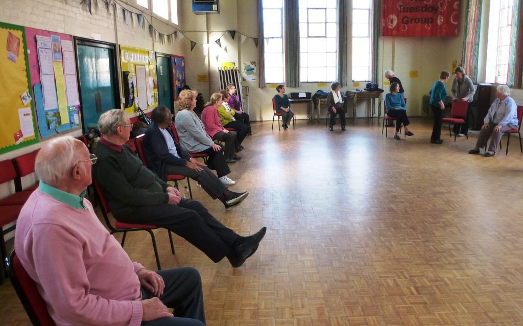 The class is based in the main hall in Wilbraham St Ninian’s Church in Chorlton. Here the group are preparing to start the class