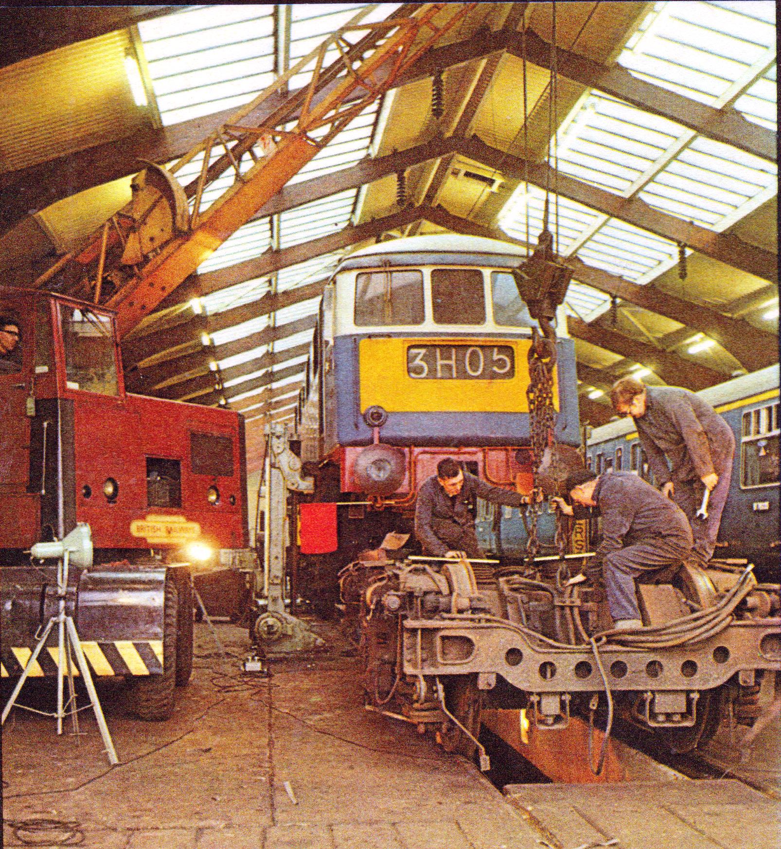 The caption on the photo reads:an electric locomotive undergoing treatment in the maintenance shed. If necessary the body is removed from the bogies and a new set of bogies is fitted. This leaves the old pair free to be serviced
