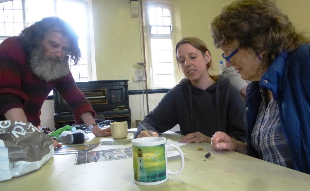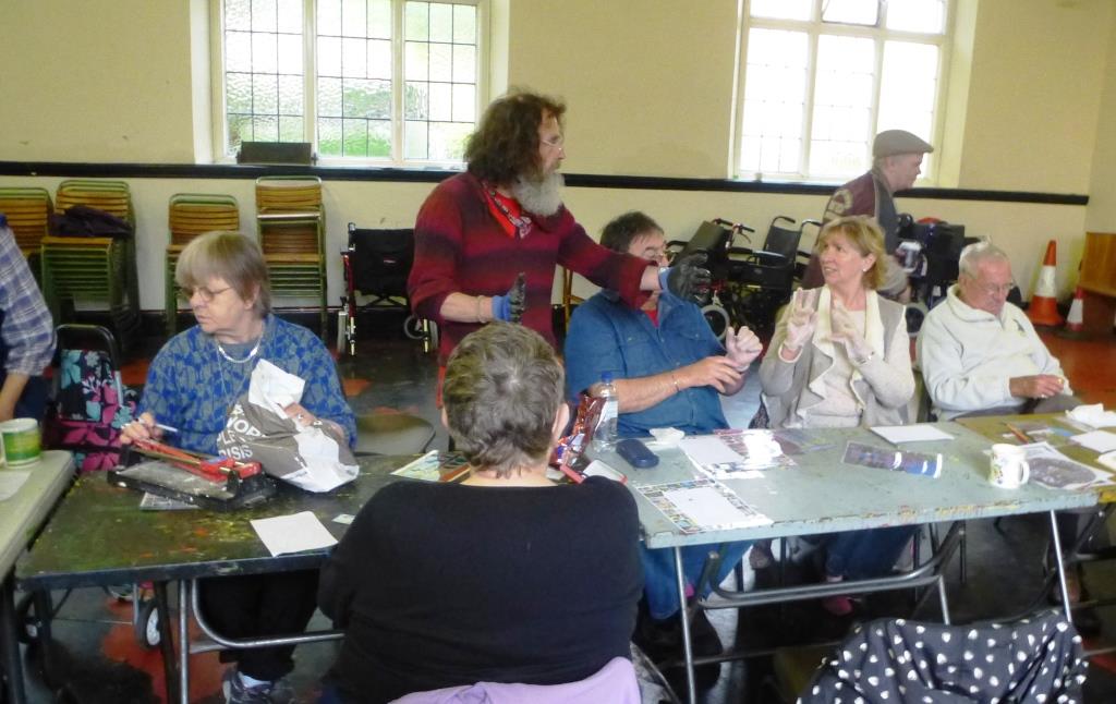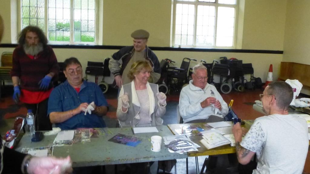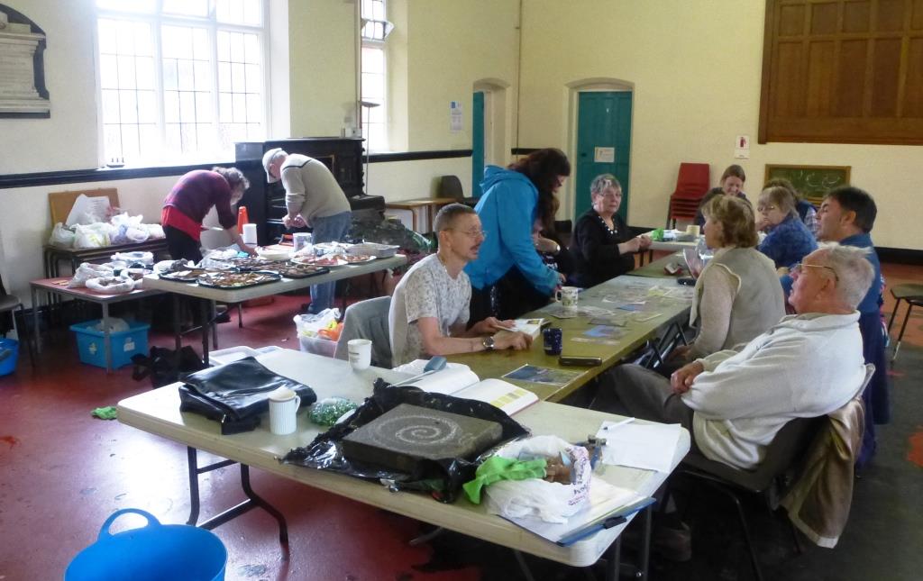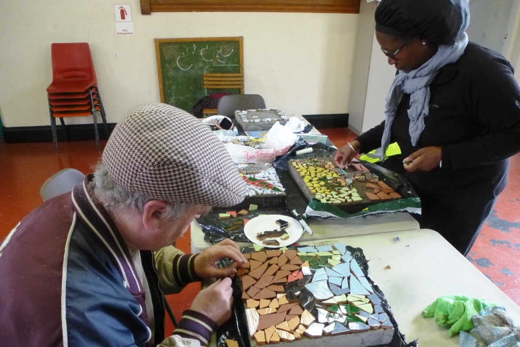 Nicola Winters lead a craft session at Chorlton Good Neighbours to make some mosaics on paving stones, to be used in the Good Neighbours garden. Members of the gardening group and an art group that uses the church hall too. all participated in making mosaics to their own designs, assisted by Nicola.