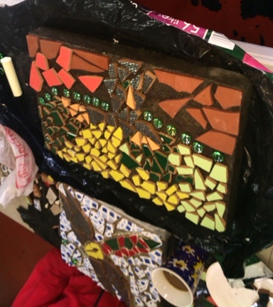 We used adhesive to fix the bits of coloured tiles and beads to the paving stone base and left them in the greenhouse to dry. Next week we will grout them and soon they will be ready to use in the garden