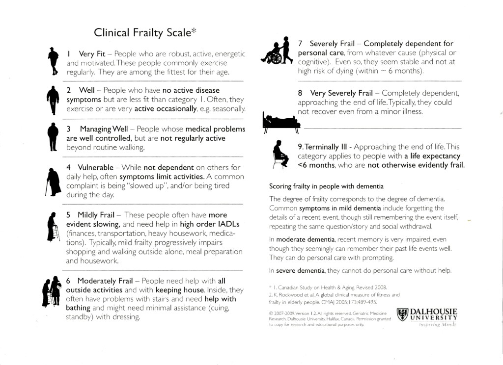 This talk on Frailty came about because Professor Rockwood is involved in a Manchester University research project called fRaill,(Frailty, Resilience And Inequality in Later Life) and Good Neighbours are represented on the Advisory Board of this study. Ken is a renowned authority on frailty being the originator of the widely used Rockwood Clinical Frailty Scale. This uses various measures to grade individuals (usually older people) on a scale of 1 to 9, with one being ‘very fit’ and 9 ‘terminally ill’ (see below)