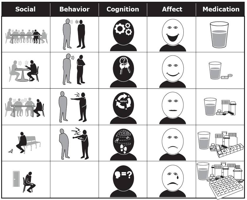What he came to Good Neighbours for was to try out a new pictorial scale of frailty where older people or their care givers could assess their own level of frailty by choosing the picture that most typifies their normal state across a range of 11 activities. A sample of these is given below. Take’medication’ as an example, if you took no medicines you would tick the first box, if you took a lot every day you may tick the 4th or 5th picture down