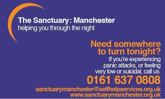 Self help Services run the Sanctuary in Manchester, it is their night service, helping people with low mood, depression, anxiety and panic attacks. As well as a number of other issues.