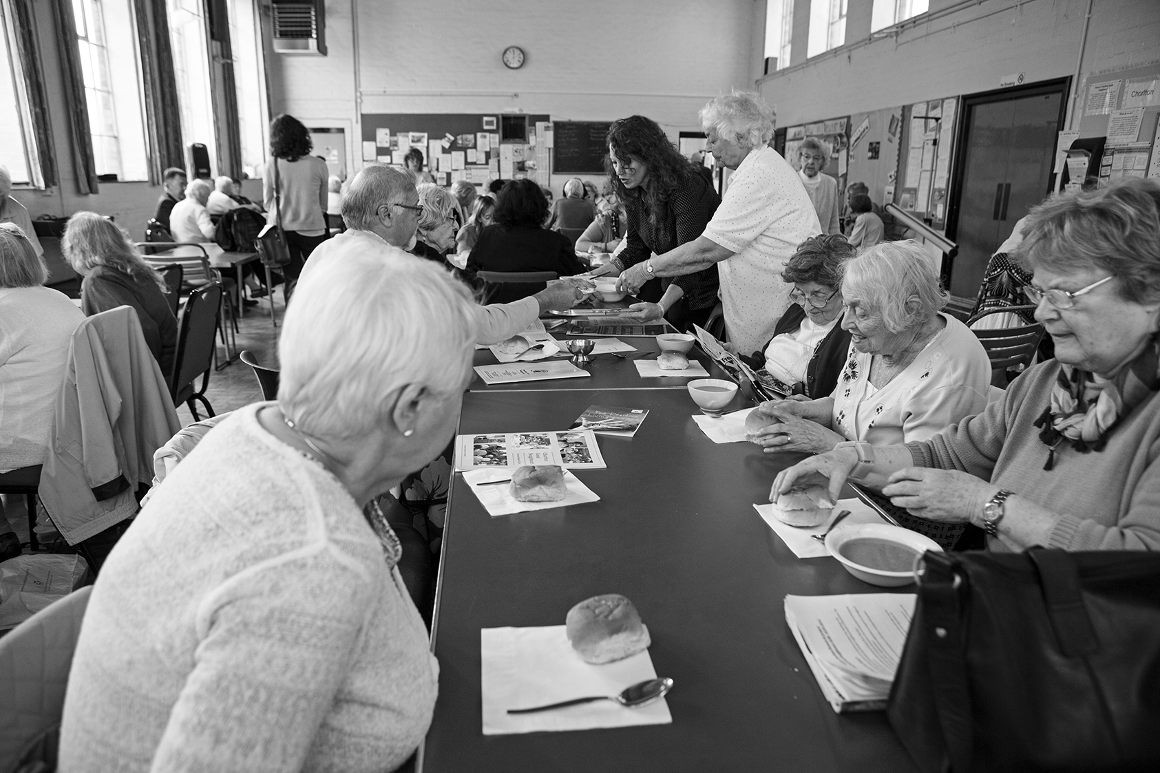 Enjoying the lunch of soup and rolls