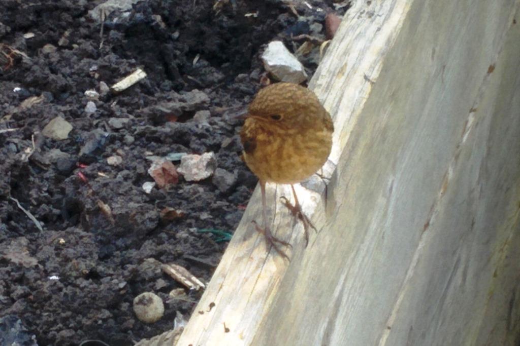 Our little friend – a young robin (without the redbreast which they acquire later) perched on the raised bed