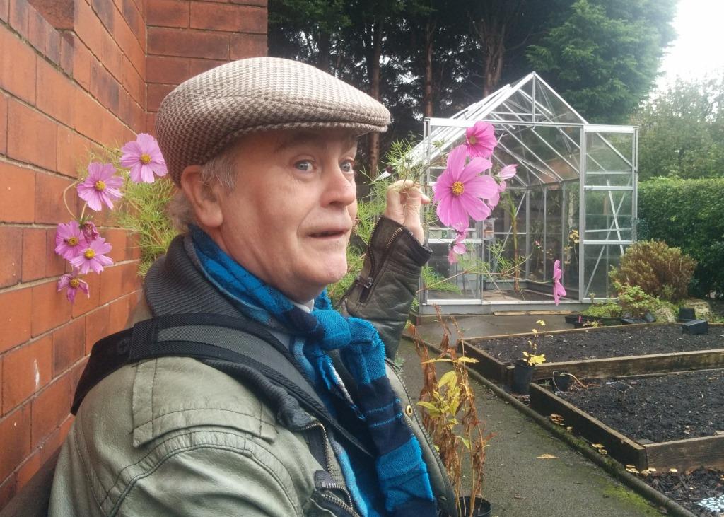 Charlotte visisted the garden recently and is pictured here with one of the late flowering cosmos flowers that Tony had planted