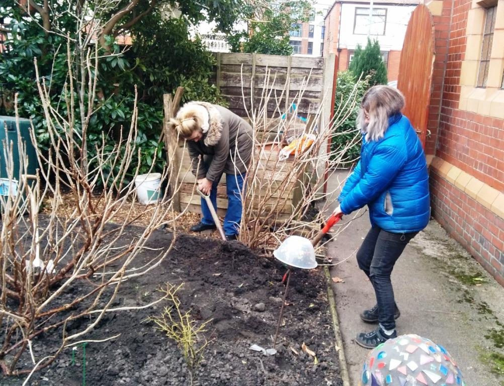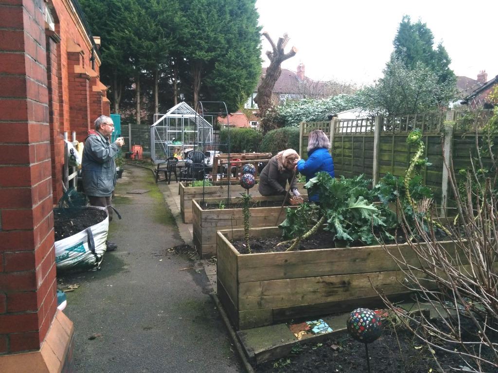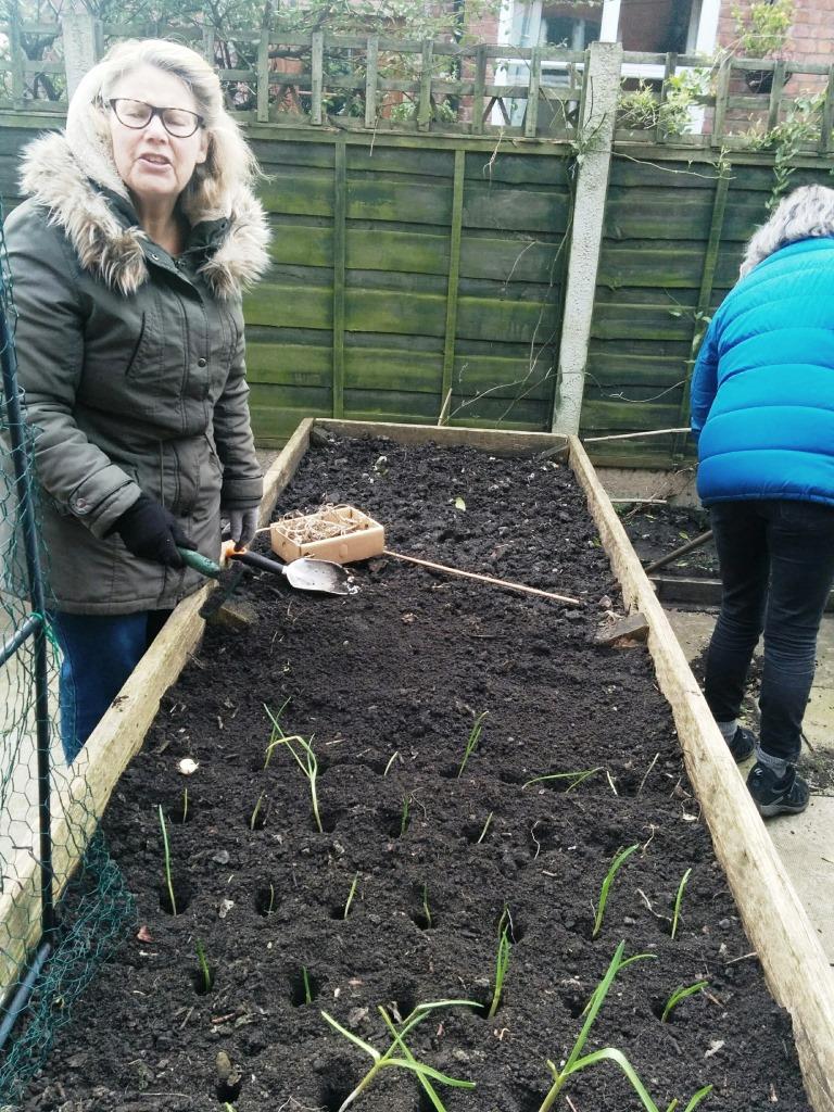 Over the last few weeks the harsh weather hasn’t stopped us from meeting up on Friday mornings for the Good Neighbours gardening group, Here Marianne and Geraldine are replanting some garlic for the coming spring. We’ve also moved a load of snowdrops to spread them round the garden. Finally the weather seems to be getting a little warmer and the days a little longer