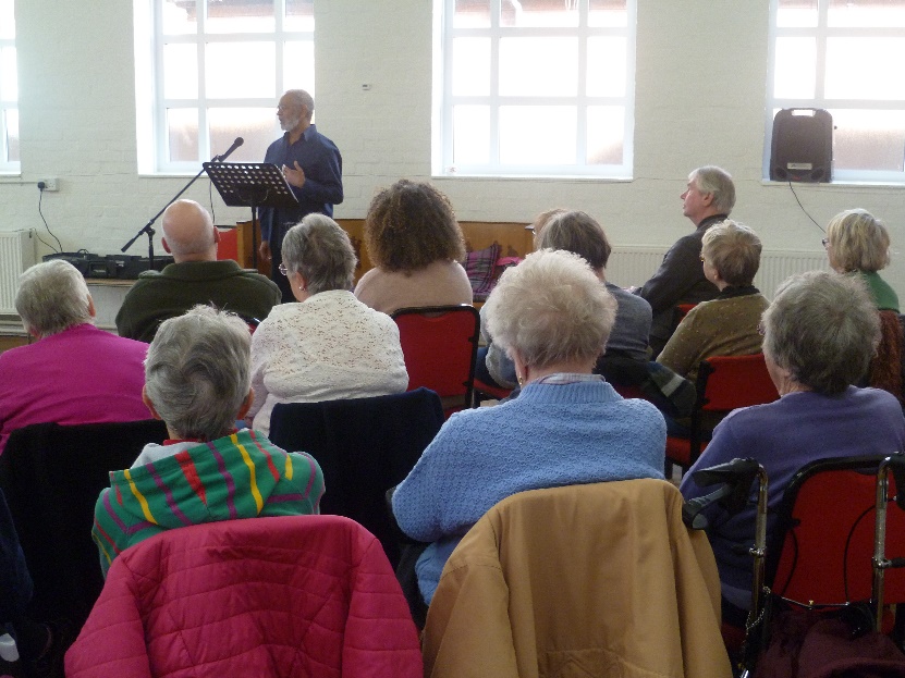 A big crowd of 46 people turned up to March’s history talk from local resident Wyllie who entertained with songs, poetry and stories of his life and background coming across from Jamaica in the 1960’s and forging his career as an actor