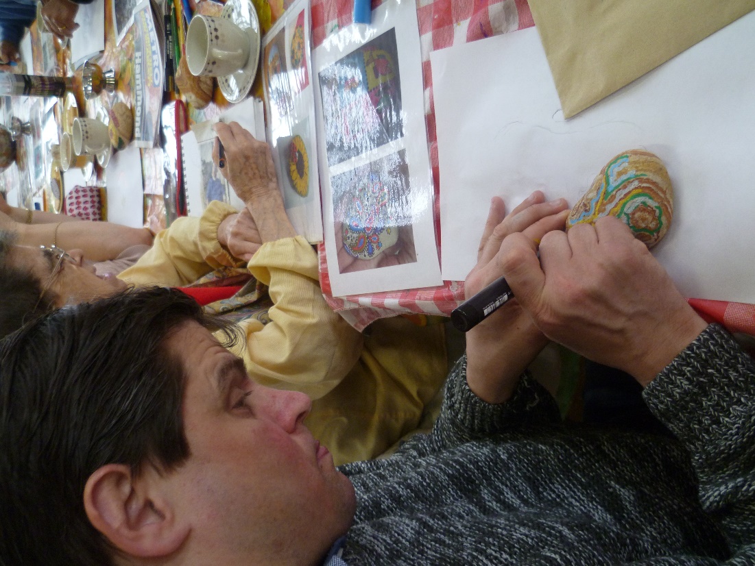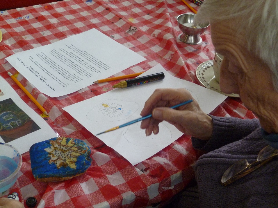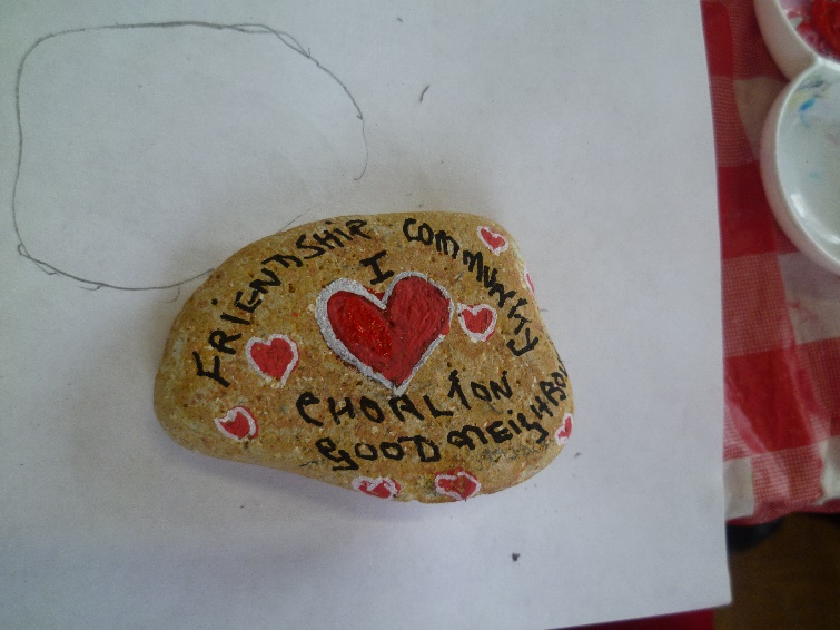 Artist Nicola Winter , supported by our Thursday coffee morning artist Susan Parry, had a very productive session at last week’s coffee morning, encouraging participants to design and create a pebble which reflects Chorlton and Chorlton Good Neighbours.