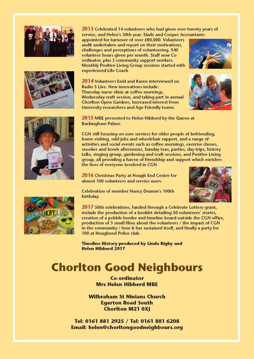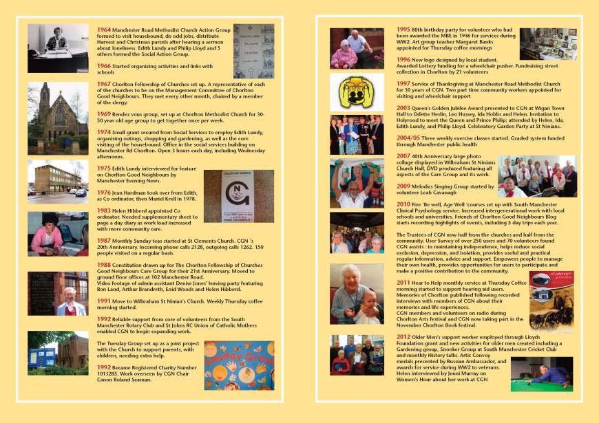 CGN timeline brochure 1967-2017 History Timeline 50 years of Chorlton Good Neighbours 1967-2017 Share this: Click to share on X (Opens in new window) X Click to share on Facebook (Opens in new window) Facebook Like Loading... Related