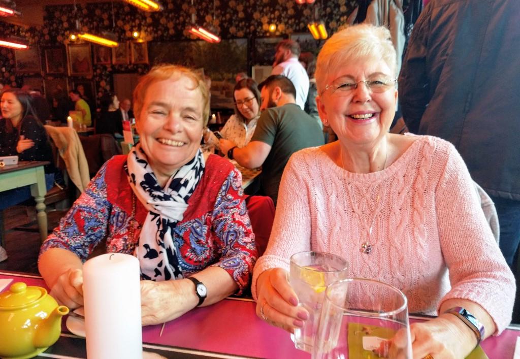 Angela and Christine enjoying a drink at the opening (a cup of tea and a tonic water!)