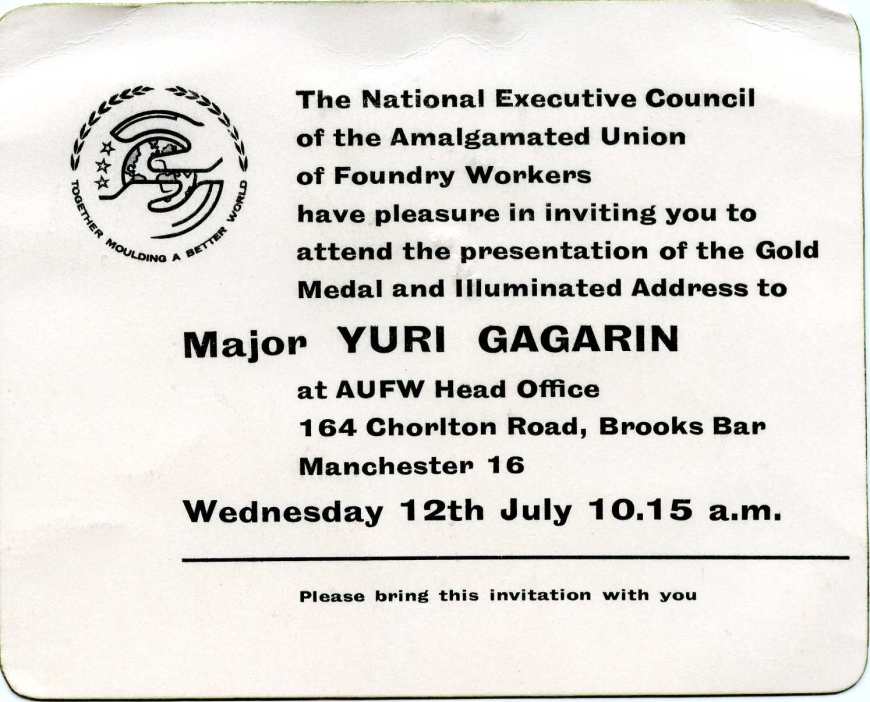 Gurbir Singh at the Chorlton Good Neighbours History group, June 7th 2012 gave a talk about the day that Yuri Gagarin, the Russian cosmanaut and first man in space, visited Manchester on 12th July 1961. He came through Chorlton and was presented with a medal by the Foundry Workers Union based at Brooks Bar, Whalley Range. Several people at the talk had seen Gagarin on the day, including Joyce Baines from Chorlton Good Neighbours who worked in the Union offices where he visited and she shook hands with him.