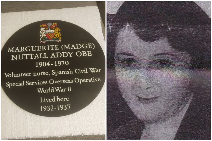Marguerite “Madge” Nuttall Addy worked as a nurse during the Spanish Civil War and before that lived & worked at a hairdressers in Chorlton. A civic plaque to her was unveiled on Manchester Road, at a civic ceremony in May 2018
