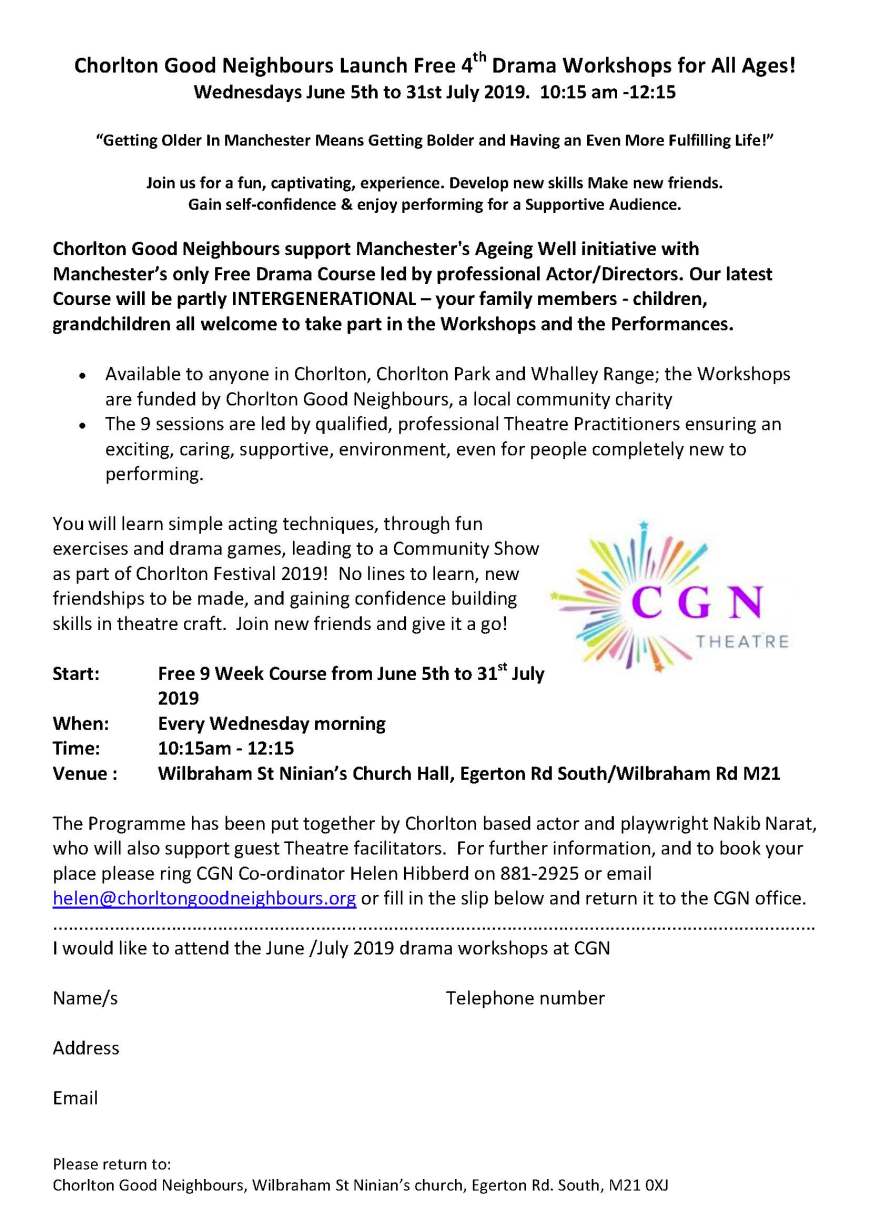 . Free sessions running from:Wednesday 5th June to 31st July 10.15-12.15, led by local actor and playwright , Nakib Narat and funded in part by a local Neighbourhood Investment fund grant .I attach a flyer explaining more about it and hope you might come along and join us if it sparks your interest. They are a really friendly group of people , and everyone just grows in confidence through enjoying the fun exercises and drama games.