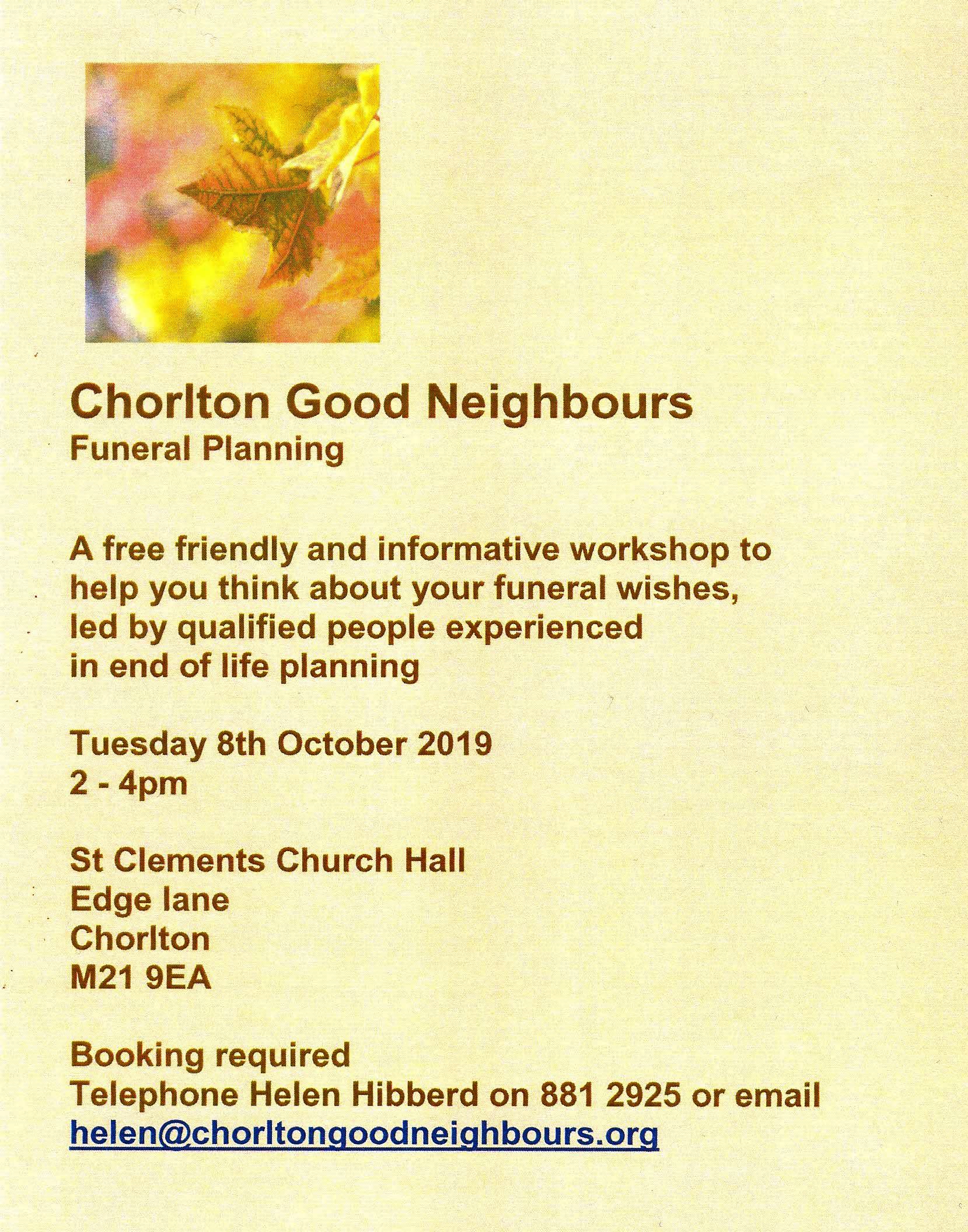 Funeral Planning workshop 8th Oct 2019 Share this: Click to share on X (Opens in new window) X Click to share on Facebook (Opens in new window) Facebook Like Loading... Related