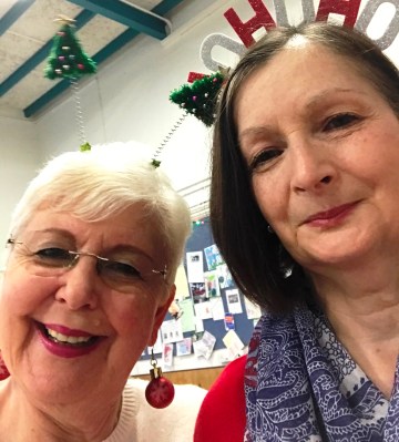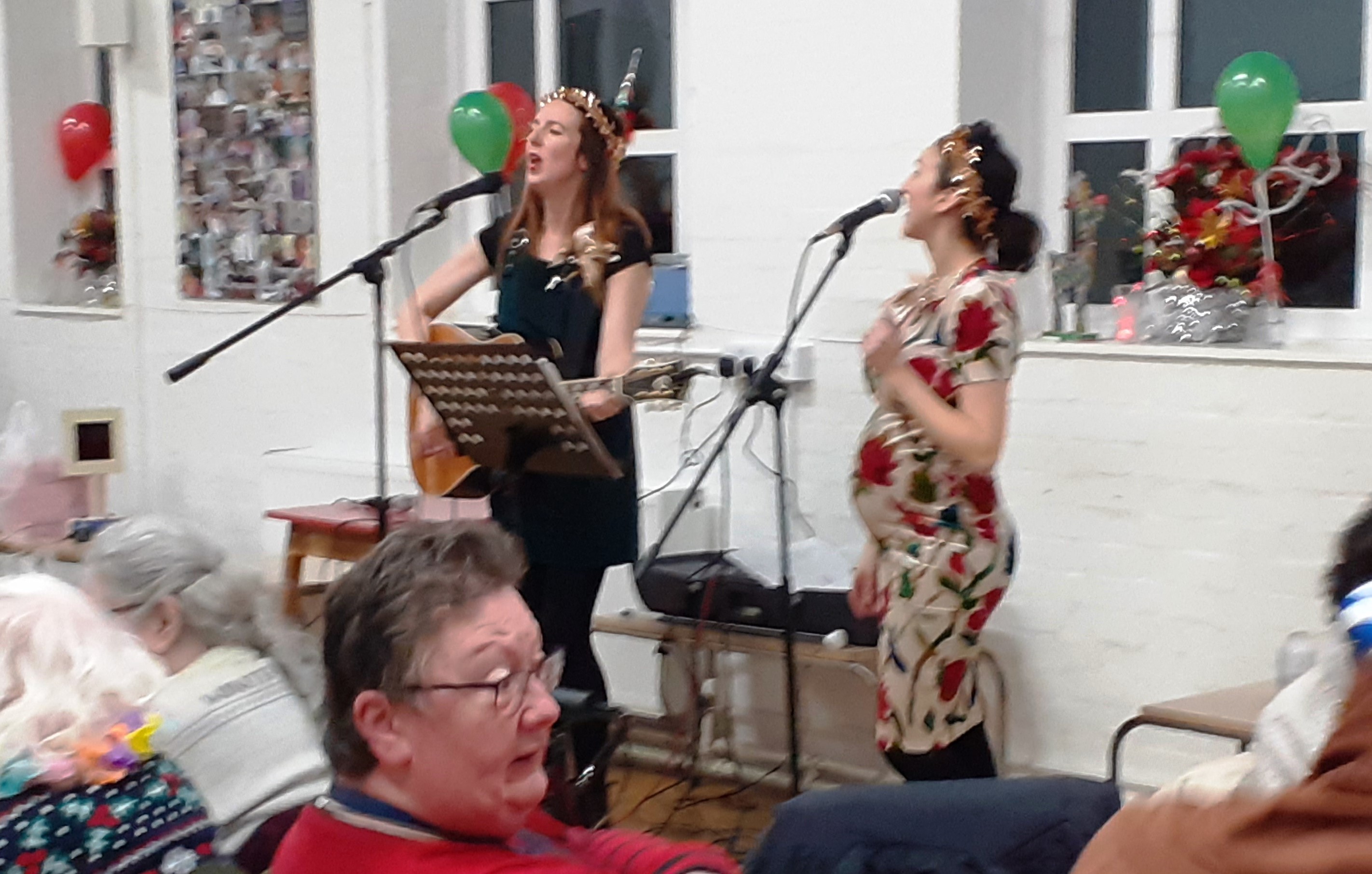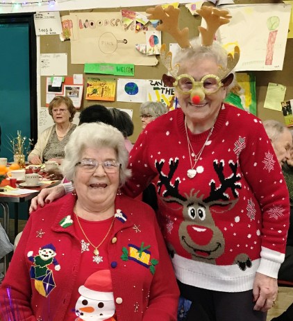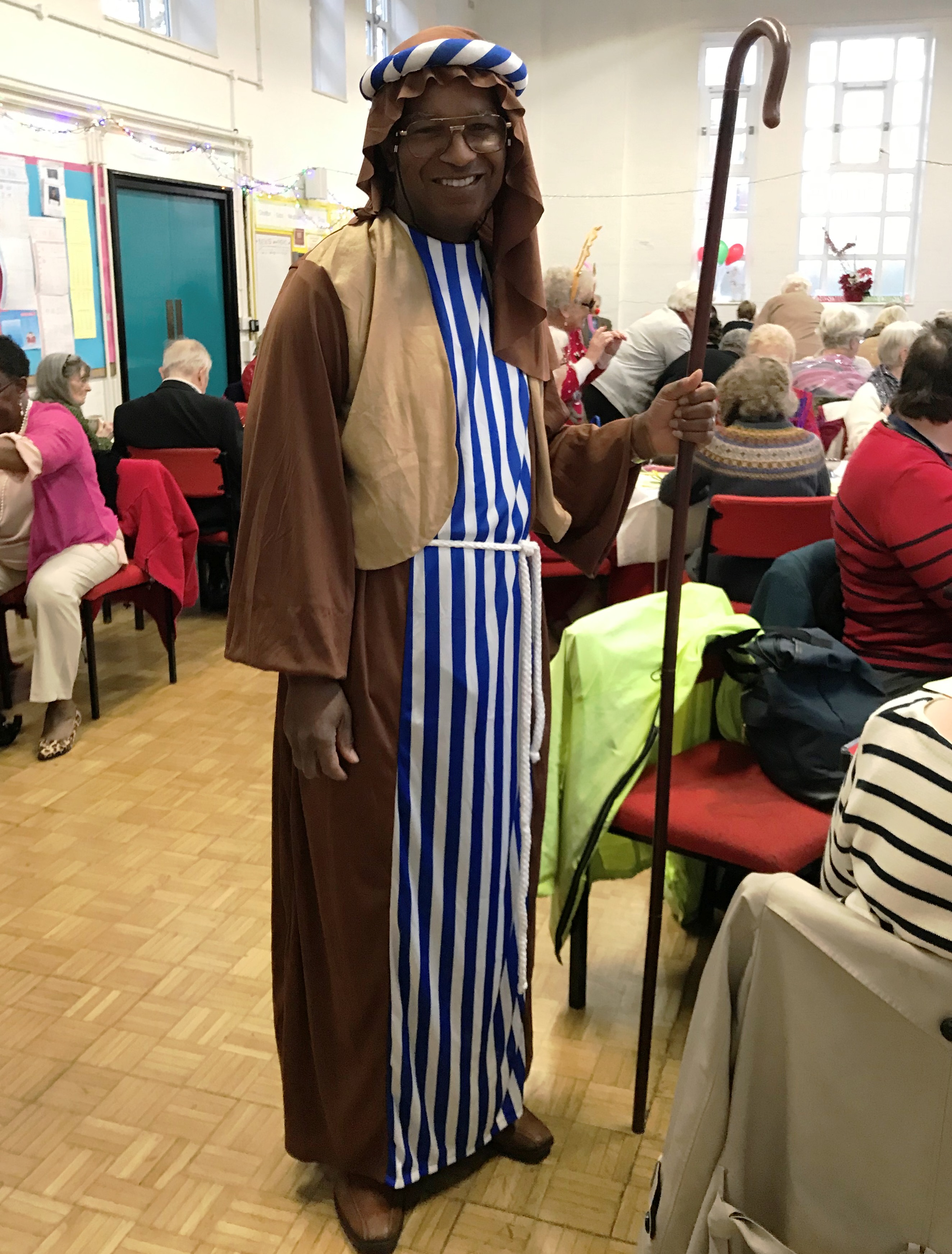 Entertainment was by the Bobbysocks , Jude and Ines, as well as 3 dance routines led by Monday exercise instructor Karen . Plenty of people got into the spirit of the season , with hats and festive jumpers , but the award for best dressed went as usual to Dennis who came as a shepherd ! many thanks as always to volunteers who gave a hand wherever they could and to Celia for all her catering.