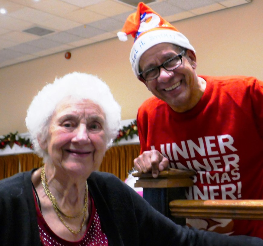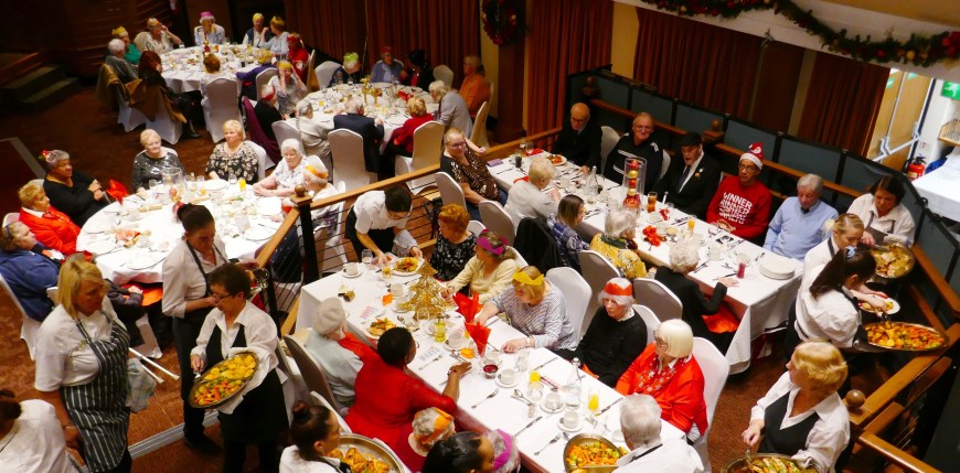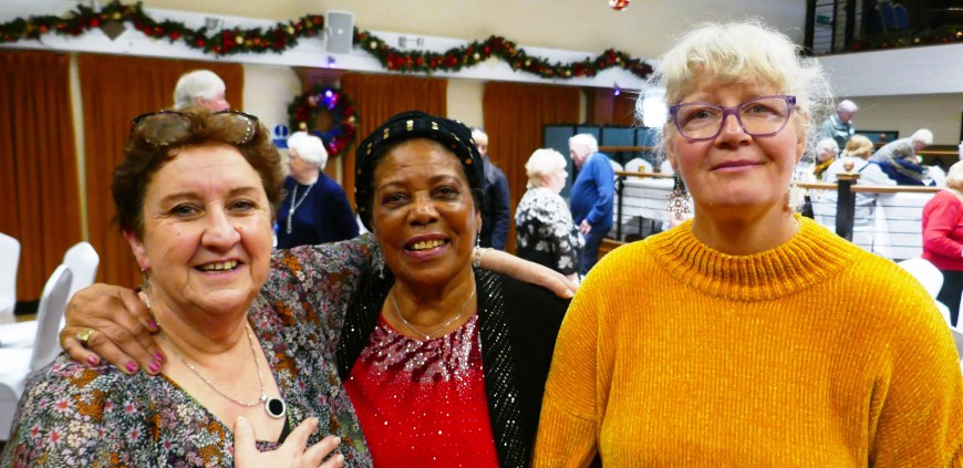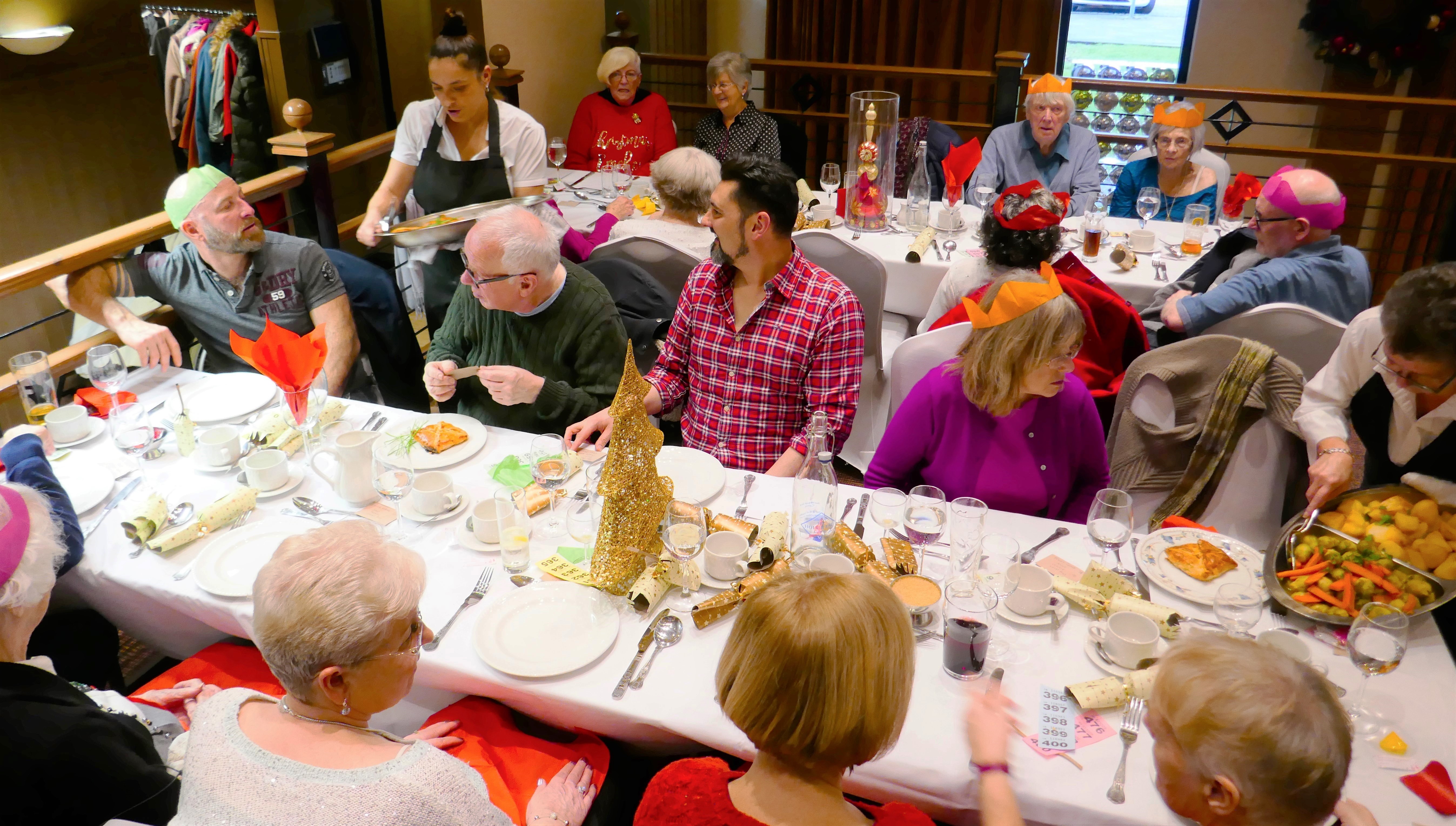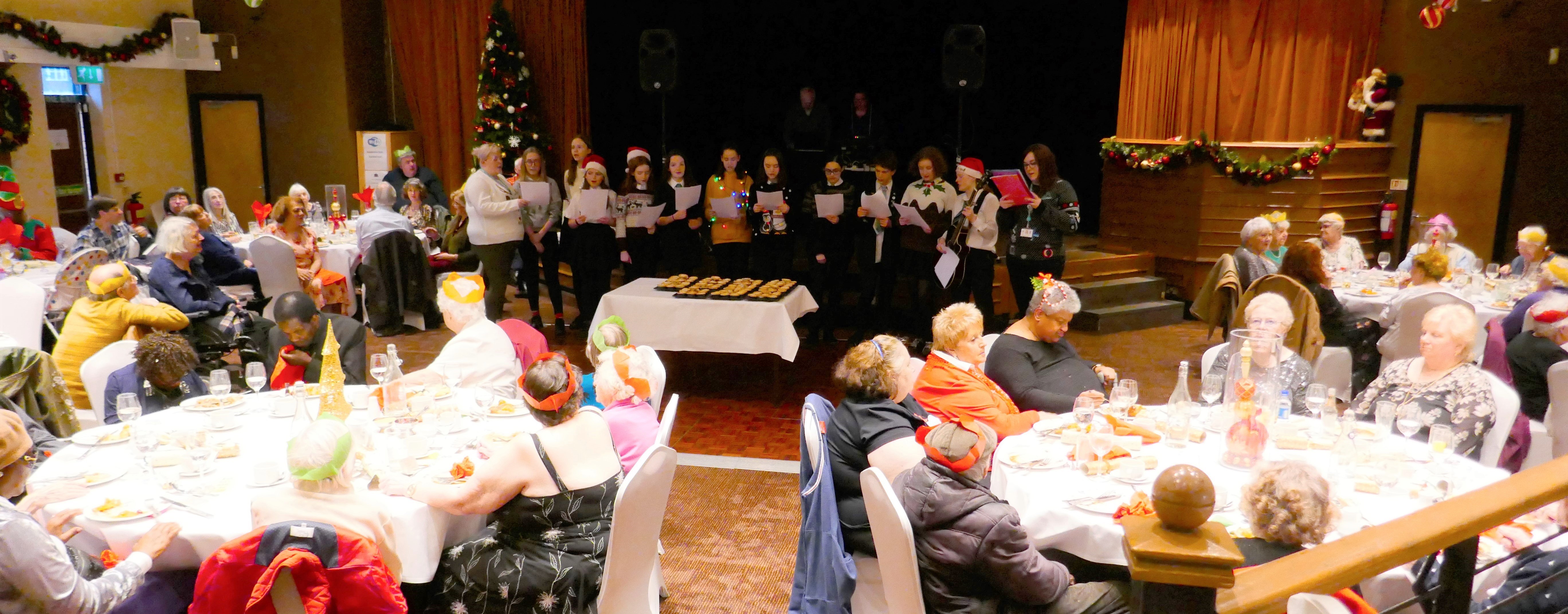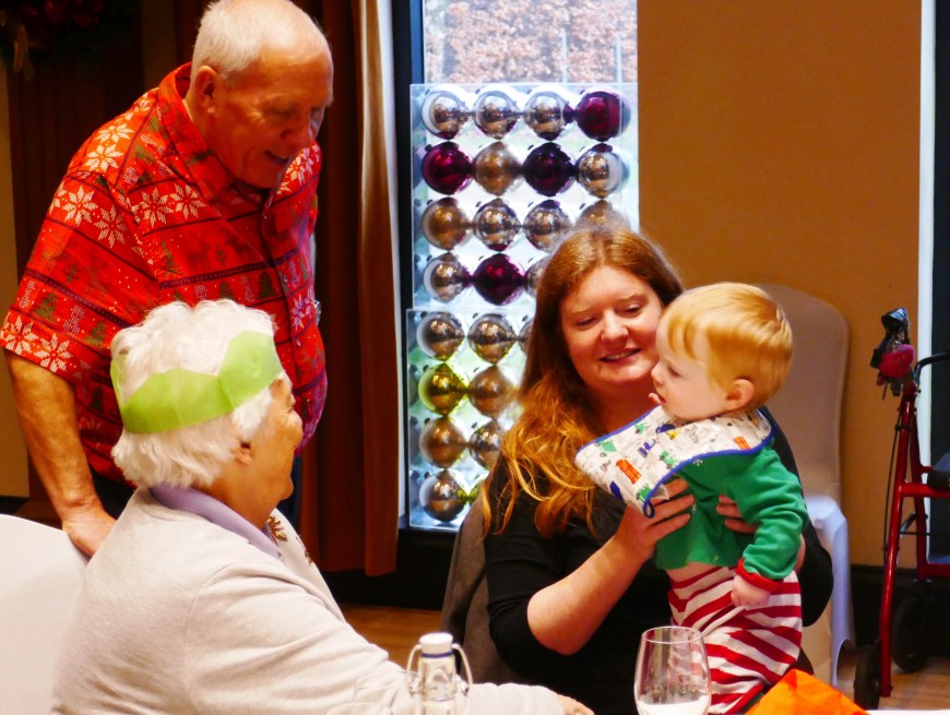 What’s not to enjoy when we have volunteer David Balderstone as the DJ , children from Chorlton High coming across to sing some Christmas carols , and the wonderful staff up at Hough end Police club ensuring we all have a lovely meal . This truly is the best way to end another fantastic year for Chorlton Good Neighbours, with older members and volunteers enjoying food together , each other’s company, dancing if you are up for it and meeting up with people who we haven’t seen for a while , like trustee Sarah with baby Charlie….