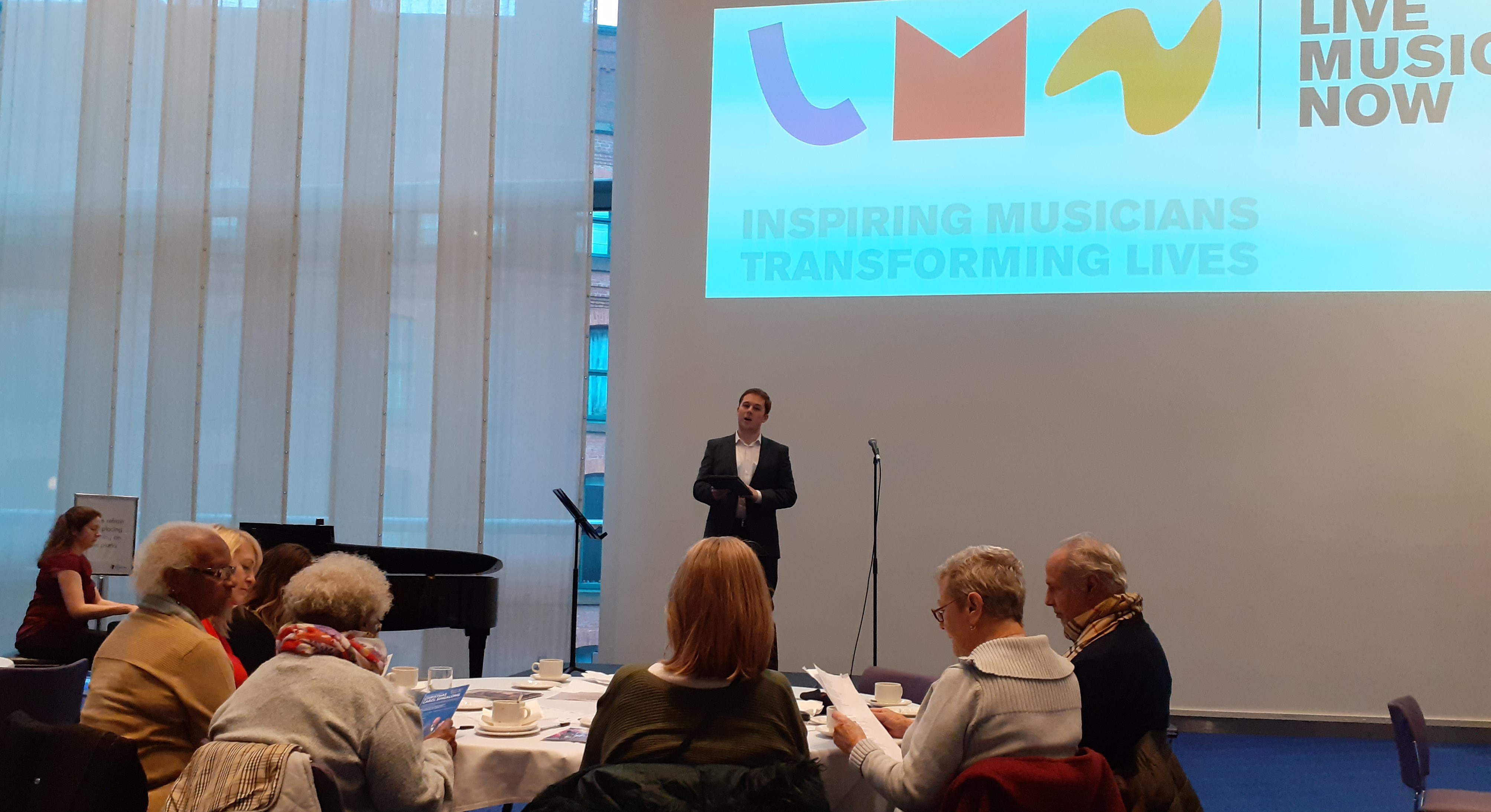 As well as the tea and cream scones we were treated to an hour’s magical singing from a charming young baritone accompanied by a wonderful pianist. There were about 50-60 older people in the audience, all of whom praised the variety of the repertoire and the warm welcome from both performers and staff. Thank you Live Music Now…