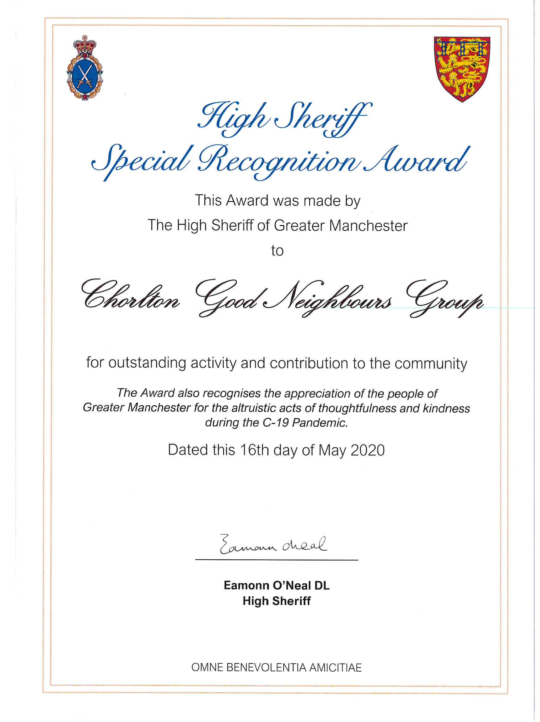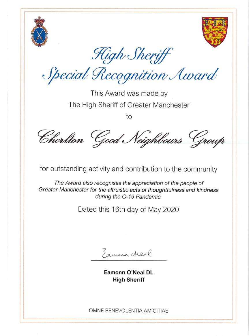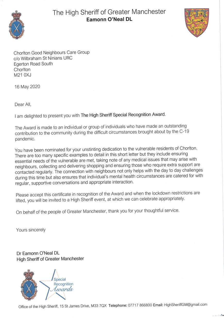 At the same time, we found that someone had taken the trouble to write to the High Sheriff of Greater Manchester to nominate CGN for the High Sheriff Recognition Award. Here is the letter we have received and the Special Recognition Award. It is uplifting to get such wonderful recognition for the staff, volunteers and all who have contributed to our community efforts during the last 7 weeks