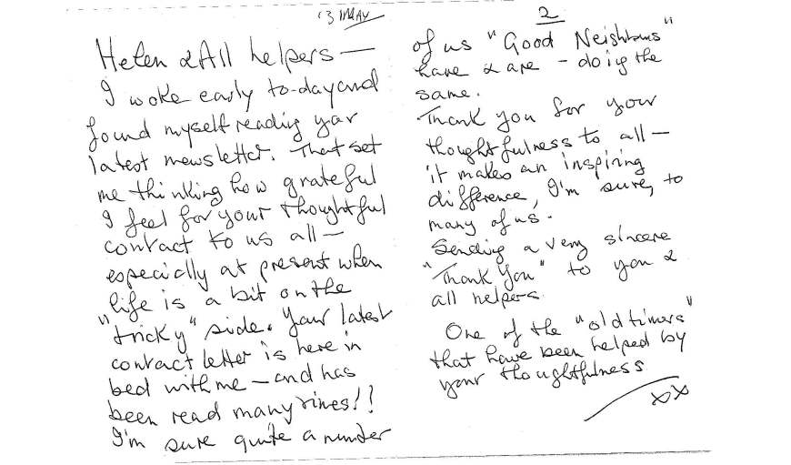 A lovely thank you letter was sent by an anonymous member to CGN which is reproduced below. I thanks Helen and all the volunteer helpers for all the support they have given during the COVID-19 pandemic crisis