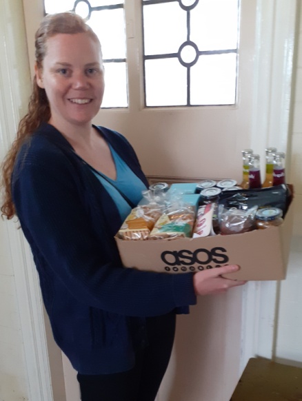 A core of 20 volunteers have been helping out with shopping , prescription collection and hearing aid battery deliveries, as well as using their daily exercise session to hand deliver the newsletters, small food item gifts from the local Unicorn store ( see Vanessa photo) and magazines, donated through Age Friendly Manchester.