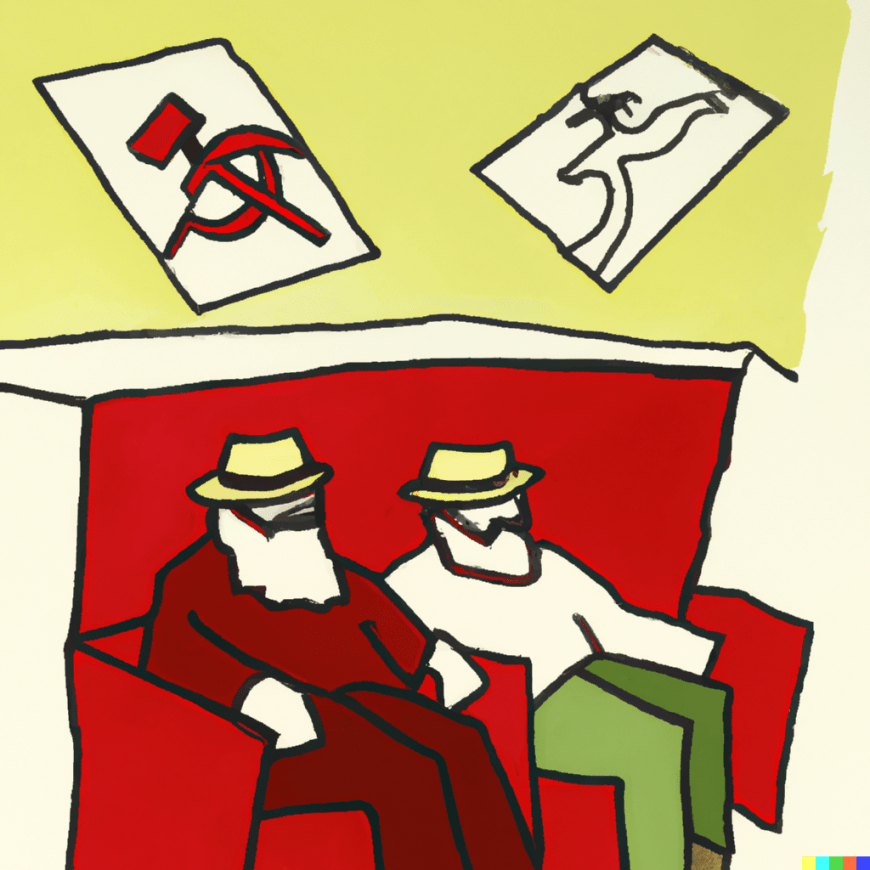 DALL·E 2023 “an image of Karl Marx & Friedrich Engels working together as drawn by David Hockney”