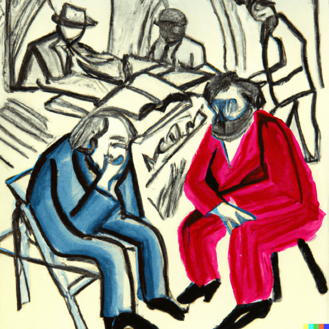 DALL·E 2023 “an image of Karl Marx & Friedrich Engels working together as drawn by David Hockney”