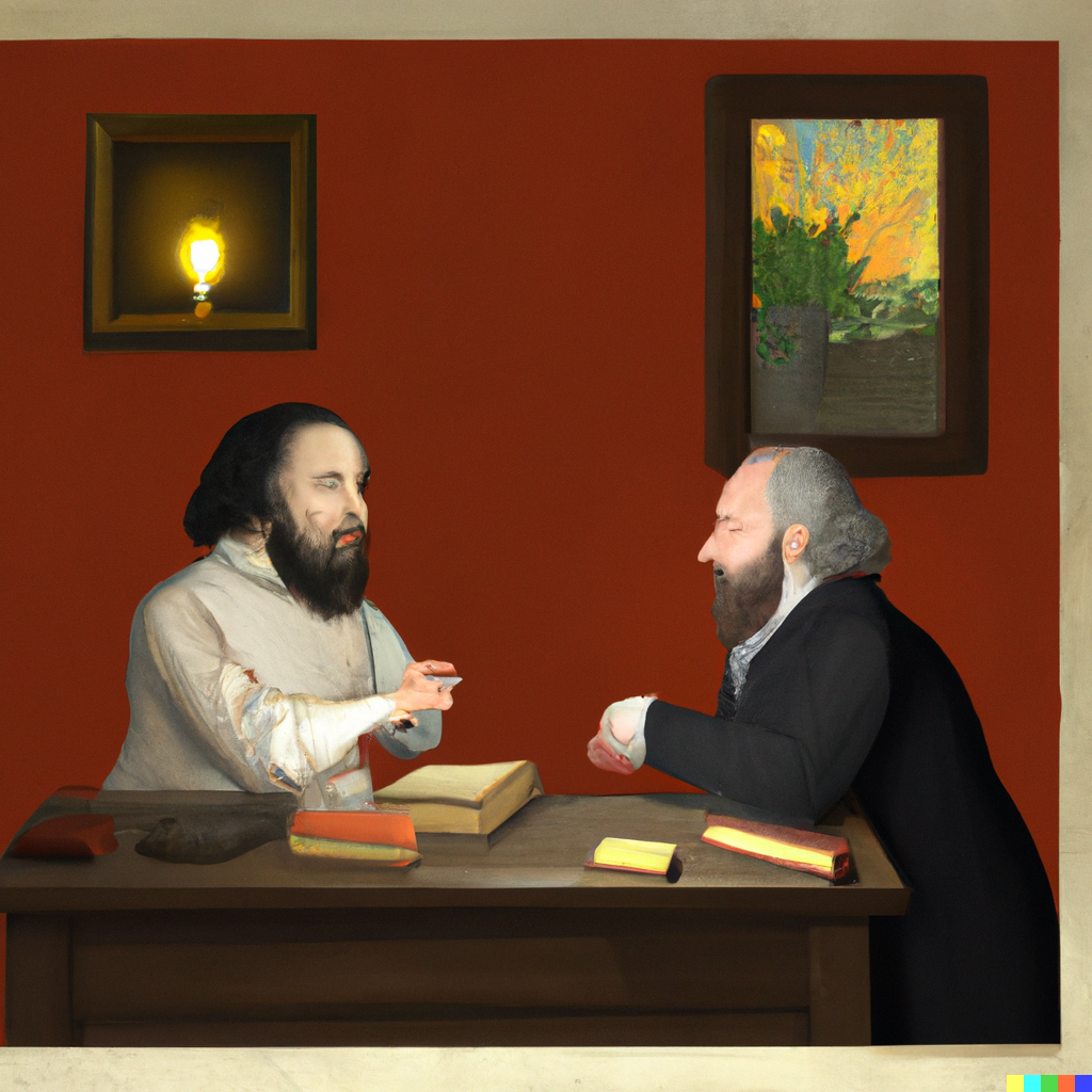 DALL·E 2023- “an image of Karl Marx & Friedrich Engels working together looking at books and having an animated conversation at a desk in Chetham’s in 1845 in the style of Dutch painter Johannes Vermeer”