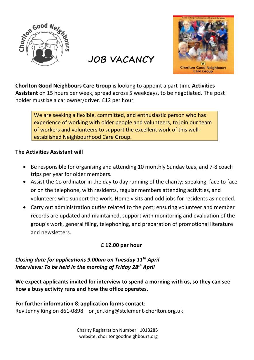 Chorlton Good Neighbours has a part-time Activities Assistant post vacancy Share this: Click to share on X (Opens in new window) X Click to share on Facebook (Opens in new window) Facebook Like Loading... Related