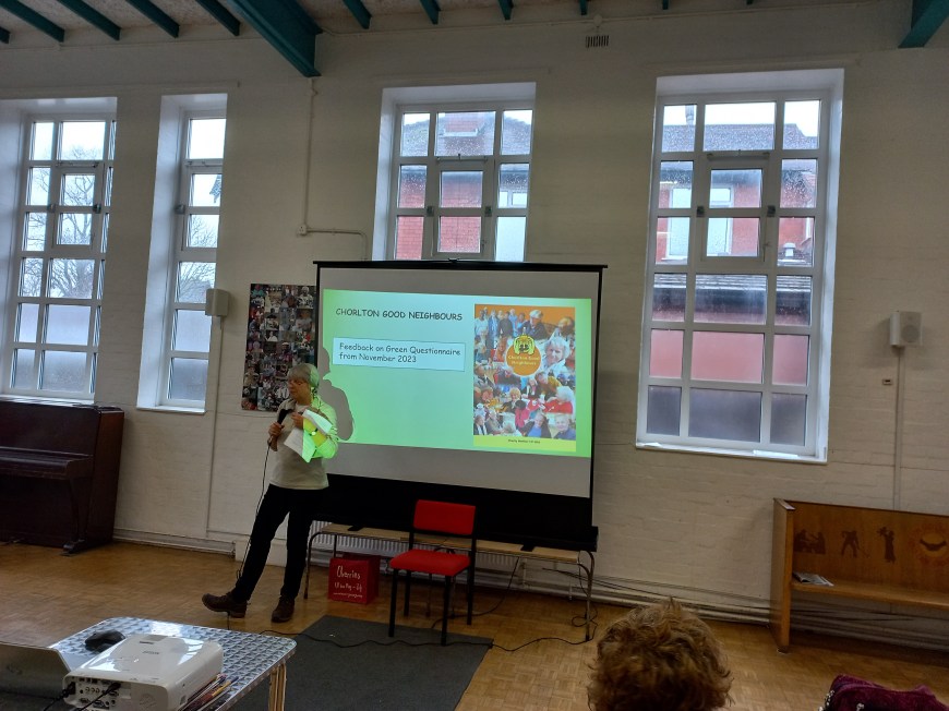 Recently Zaza Donohue gave out a questionnaire about green issues (mainly re-cycling) to about 60 of Chorlton Good Neighbours attending our popular weekly coffee mornings. This is the feedback session Zaza gave on Feb 8th 2024.