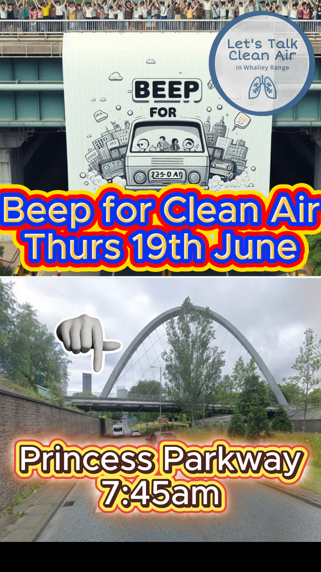 Its Clean Air day on Thurs June 19th 2025, ‘Let’s Talk Clean Air’ Whalley Range are starting it off with a banner drop on Princess Parkway in Hulme to encourage motorists to beep their horns to show support.