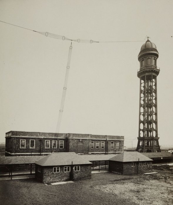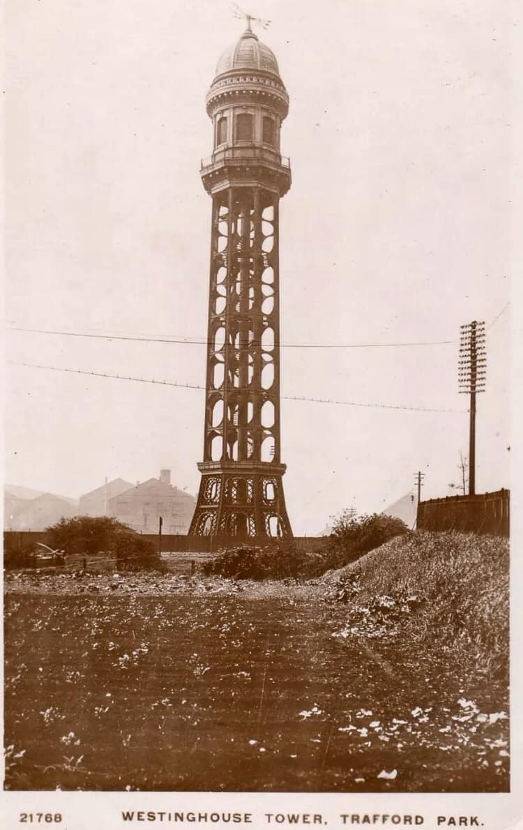 The transmitter was installed on the ornate cast iron water tower at the Metrovicks works in Trafford Park, Manchester.