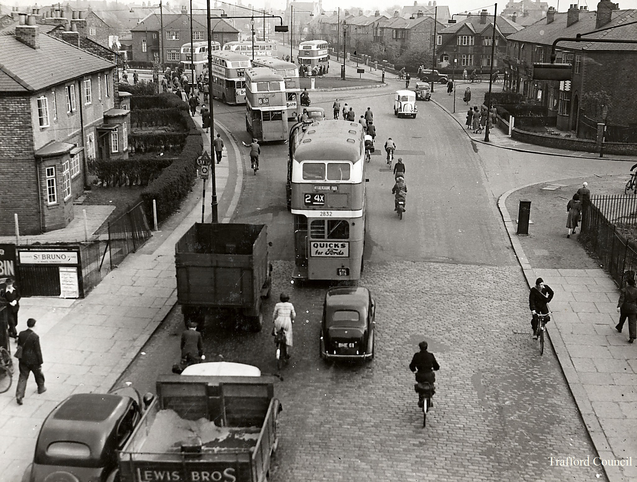 Five ways roundabout in the 1950s, as workers head home on foot, bike and buses. The road on the left is Davyhulme Road East where I lived as a child