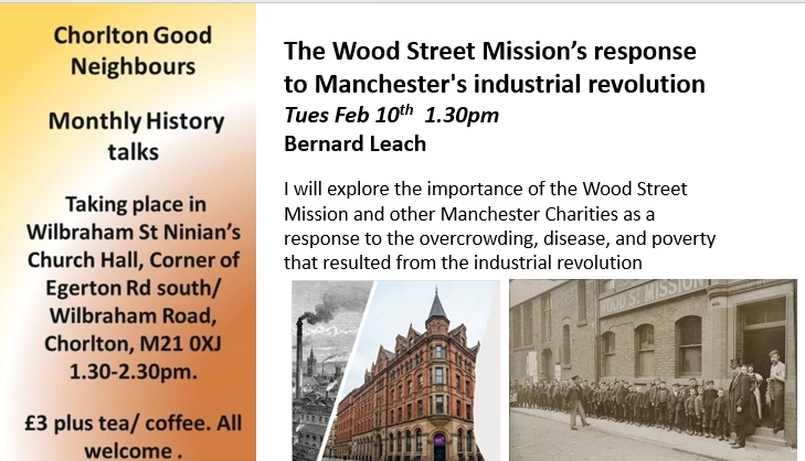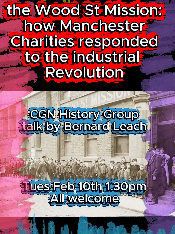 This CGN history talk will explore the importance of the Wood Street Mission and other Manchester Charities as a response to the Industrial Revolution that transformed the city in the 19th Century but also led to overcrowding, disease and great poverty