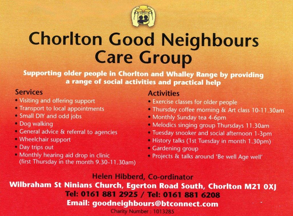 - A Good Neighbours Radio Programme was made for Chorlton FM and was broadcast during the Chorlton Arts Festival in May 2012. There were interviews with the Good Neighbours Coordinator, Helen Hibberd, with wheelchair support worker, Amanda and with several volunteers . The radio broadcast can be heard at http://goo.gl/2iecD