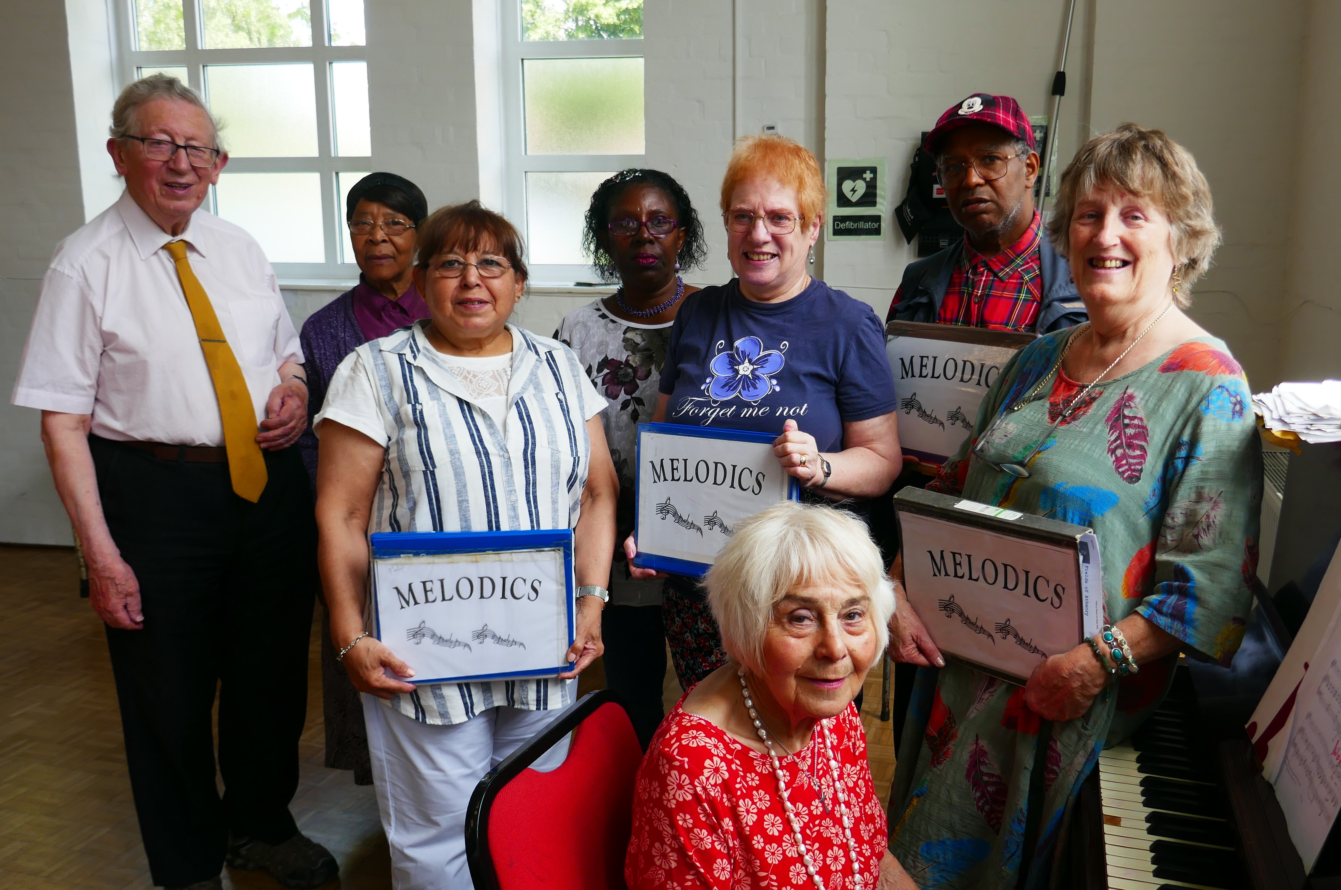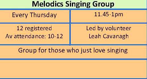 Volunteer Mary writes: CGN Melodics singing group was started by our musical director, Leah Cavanagh, 10 years ago, and has been meeting weekly ever since. We meet every Thursday morning after Coffee Morning and sing from 11.45 – 1.00p.m. There are usually about 12 of us there, and we sometimes go for lunch afterwards together.