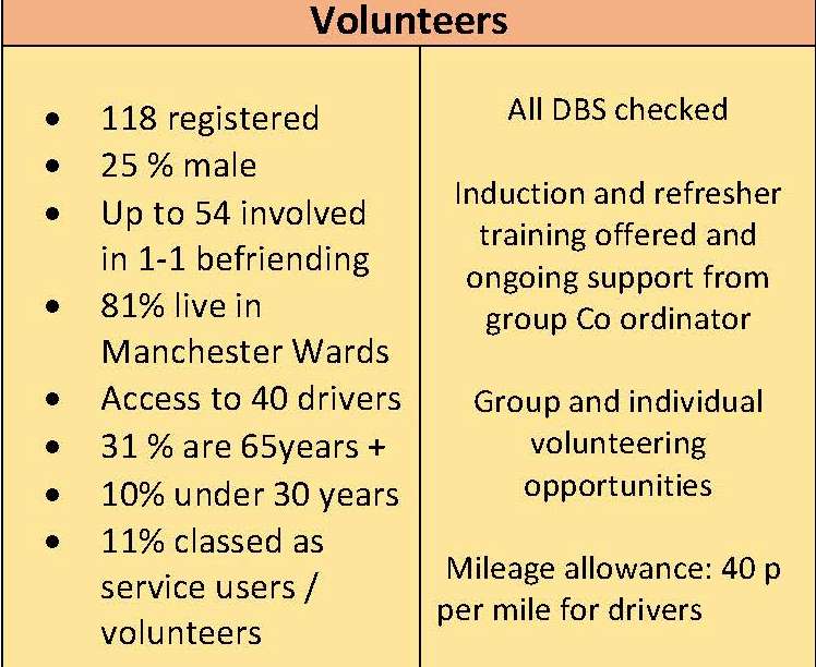 Chorlton Good Neighbours has more than 100 volunteers to call upon. They help with and perform a range of activities: